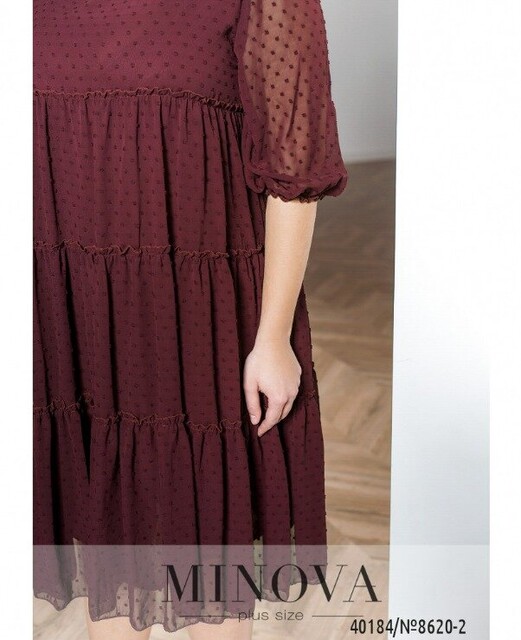 Легка, зручна та приваблива сукня батал з підкладкою та сіточкою. Сіточка призібрана складками в декілька рядів. Рукава - з сіточки без підкладки, мають вшиті резинки. Кишень і застібок немає, виріз горловини "човник".