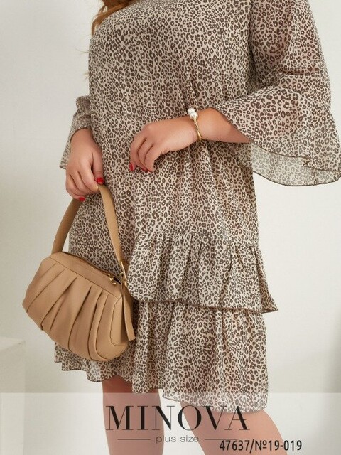 Легка та зручна сукня батал з м'якою нижньою тканиною та напівпрозорою верхньою. Поділ та рукава прикрашені оборками, які на подолі починаються збоку. Виріз горловини півкруглий. Кишень немає. Застібка - гудзик ззаду під шиєю.