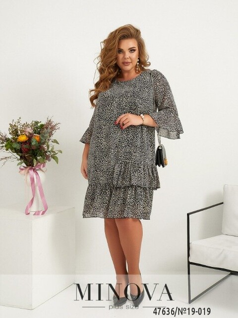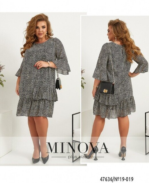 Легка та зручна сукня батал з м'якою нижньою тканиною та напівпрозорою верхньою. Поділ та рукава прикрашені оборками, які на подолі починаються збоку. Виріз горловини півкруглий. Кишень немає. Застібка - гудзик ззаду під шиєю.