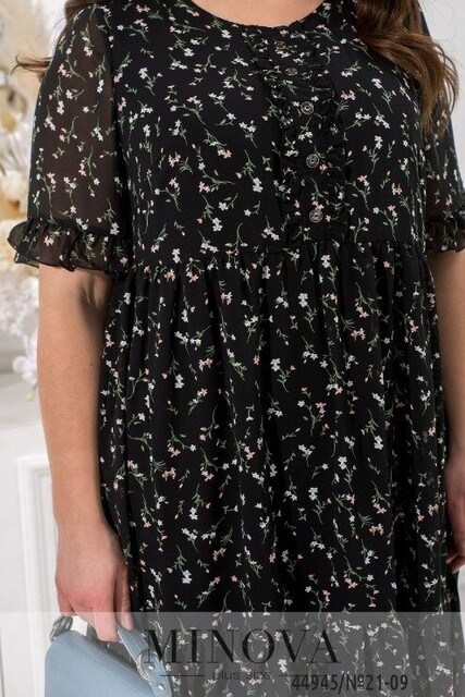 Зручна сукня А-силуету з романтичним принтом. Без застібок та кишень, на грудях від півкруглого вирізу горловини до талії - декоративні гудзики на планці. Внизу м'який підкладочний шар. Рукава без підкладки, напівпрозорі, до них вшито резинки, манжети - невеликі оборки. Поділ з оборками.