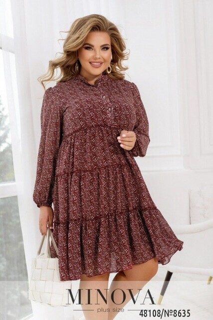Неможливо уявити собі більш жіночний наряд, ніж ніжна і легка сукня, що виконана з невагомої шифонової тканини і складається з декількох шарів воланів. Такій сукні дорогі прикраси не потрібні - вона сама і є прикрасою. Модель доповнена м'якою трикотажною підкладкою, рукавами довжиною 3/4 з вшитими в манжети резинками і невеликим коміром-стійкою. Сукня застібається на ряд гудзиків, розташованих спереду на планці.