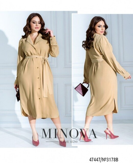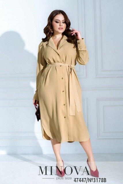 Приваблива повсякденна сукня з рядом робочих гудзиків спереду та відкладним коміром порадує шанувальниць практичного одягу на кожен день. Модель доповнена довгими рукавами з манжетами на ґудзиках та текстильним поясом, що входить до комплекту.