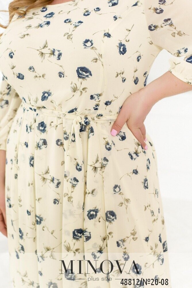 Елегантна жіночна сукня з принтом, виріз горловини півкруглий, застібка - вшита по спинці блискавка, кишень немає. Поділ відрізний, спадає плісованими оборками. Ліф та поділ з м'яким нижнім шаром, верхній шар напівпрозорий. Рукава без підкладочного шару, на зап'ястках вшиті резинки. На талії повздовжні виточки вгору.