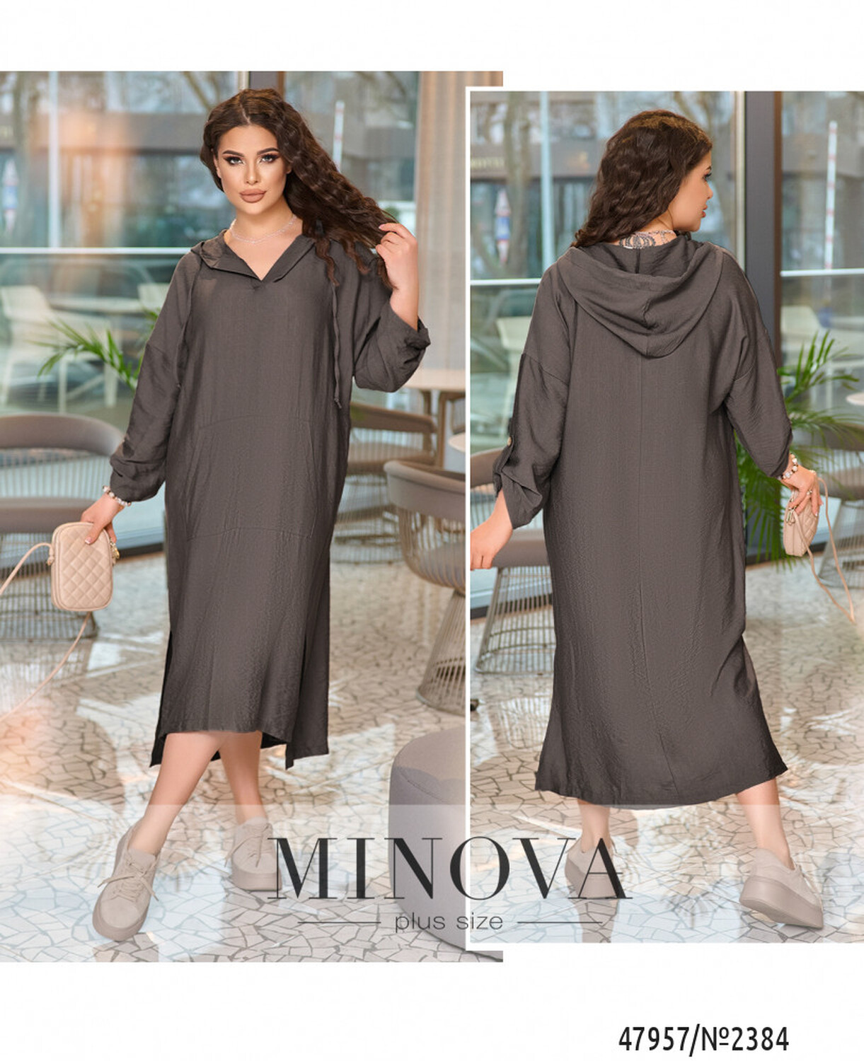 Сучасна та стильна сукня спортивного крою довжини максі зі спущеними плечима. Сукня вільного крою в стилі оверсайз з довгим рукавом, який доповнений не функціональною шлейкою на ґудзику. Ми зробили не великий виріз горловини V-форми, який переходить в капюшон . Дизайнери додали велику функціональну кишеню на передню частину сукні. Сукня подовжена по спинці, а по боковій частині подолу ми зробили розрізи які додають повітряності образу.