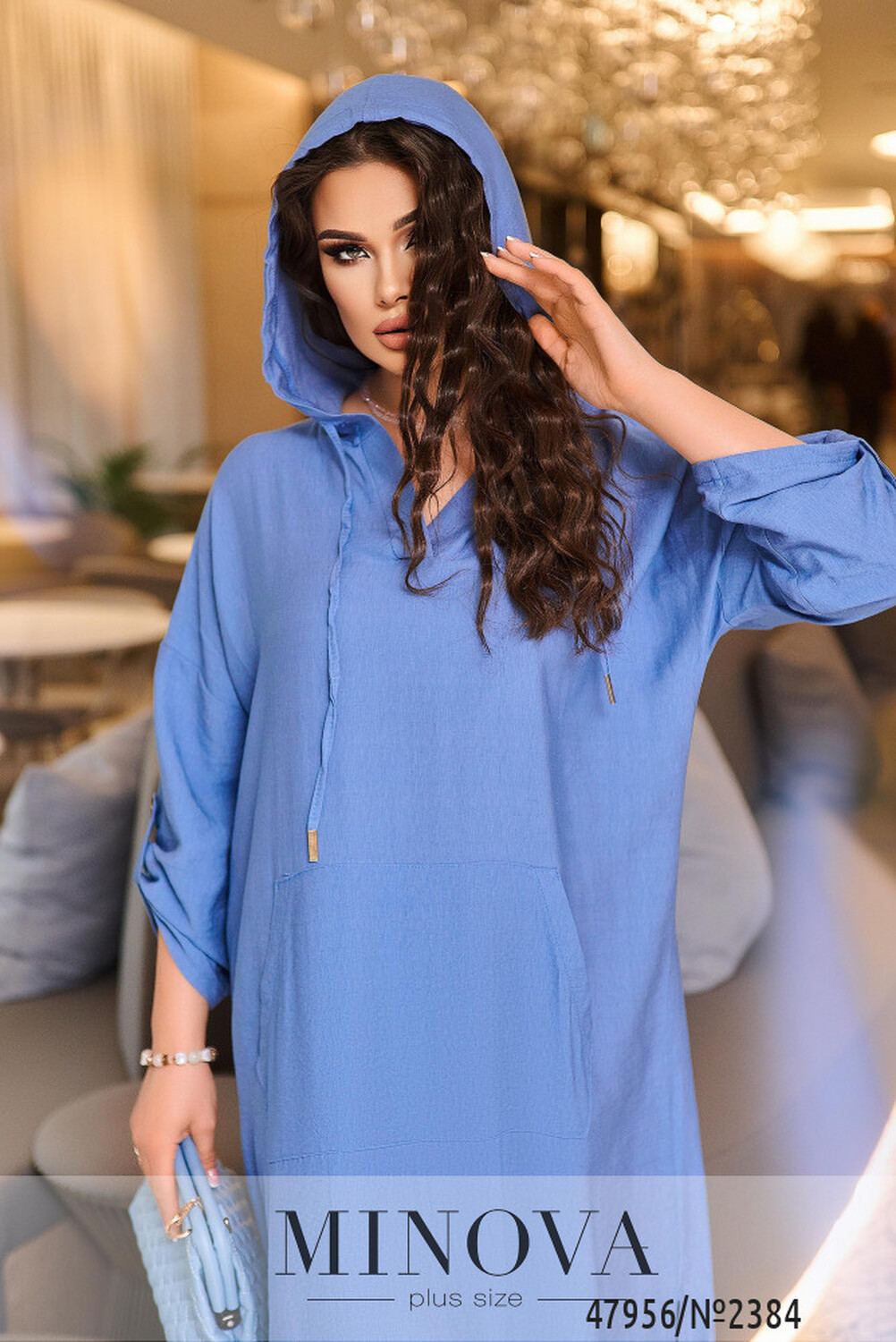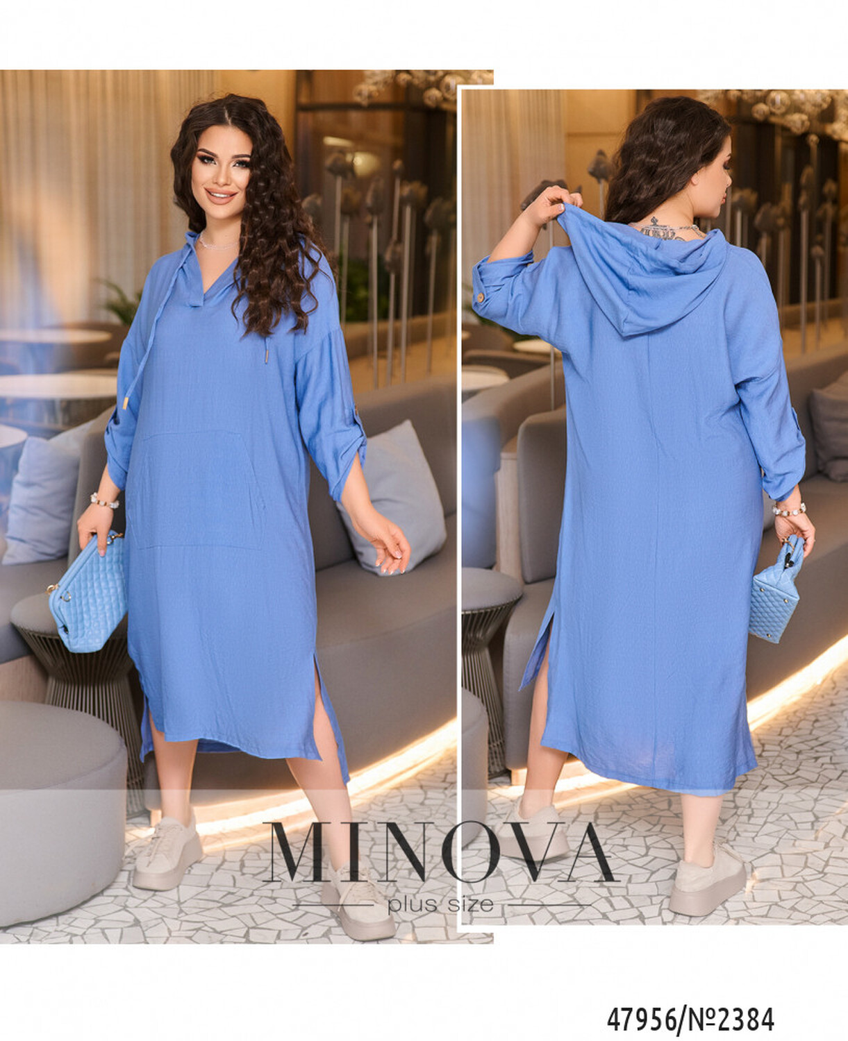 Сучасна та стильна сукня спортивного крою довжини максі зі спущеними плечима. Сукня вільного крою в стилі оверсайз з довгим рукавом, який доповнений не функціональною шлейкою на ґудзику. Ми зробили не великий виріз горловини V-форми, який переходить в капюшон . Дизайнери додали велику функціональну кишеню на передню частину сукні. Сукня подовжена по спинці, а по боковій частині подолу ми зробили розрізи які додають повітряності образу.