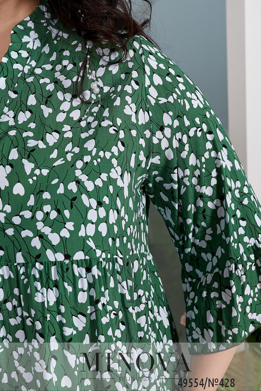 Ця легка сукня міді зроблена з ніжного штапелю і стане неперевершеною частинкою вашого гардеробу. Горловина сукні має м'яку V-форму, додаючи жіночності та шарму. Рукава сукні мають довжину 7/8 і прикрашені воланом. Ліф сукні відрізний, а з нього плавно спадають два рівні воланів, які додають об'єму та рухливості.