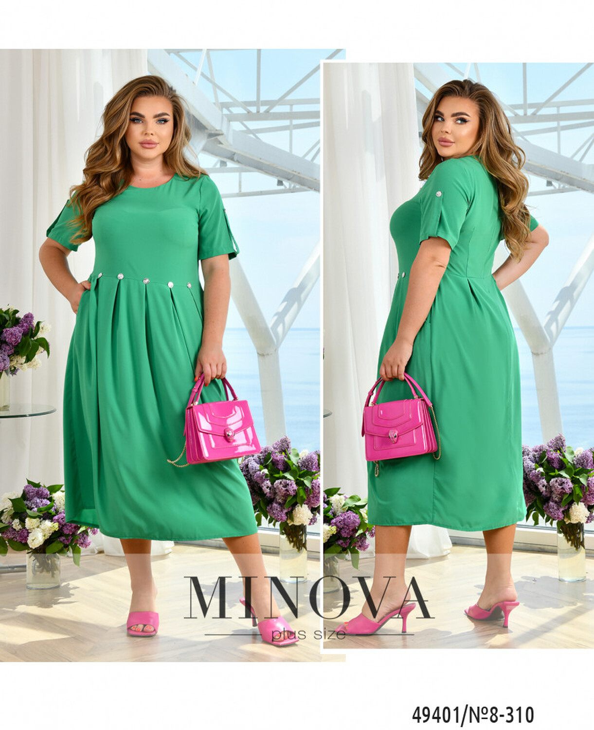 Легка лаконічна сукня міді з короткими рукавами і змійкою на спинці виконана в актуальних однотонних відтінках. Родзинкою цієї моделі стали зручні кишені в бічних швах і широкі складки на спідниці, декоровані гудзиками по лінії талії.