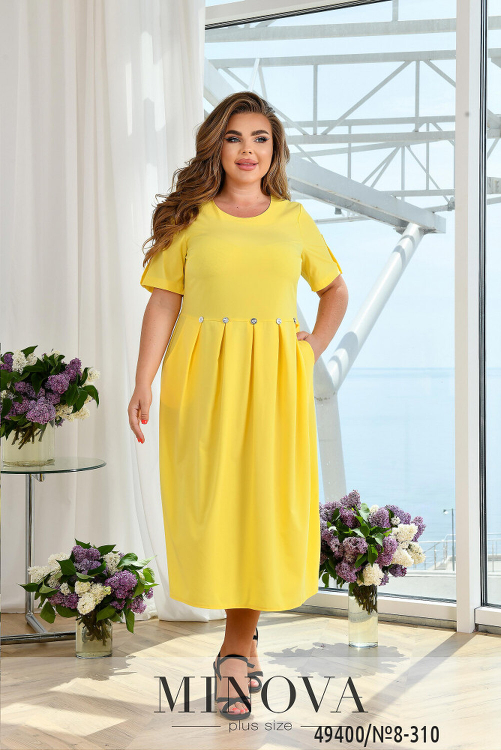 Легка лаконічна сукня міді з короткими рукавами і змійкою на спинці виконана в актуальних однотонних відтінках. Родзинкою цієї моделі стали зручні кишені в бічних швах і широкі складки на спідниці, декоровані гудзиками по лінії талії.