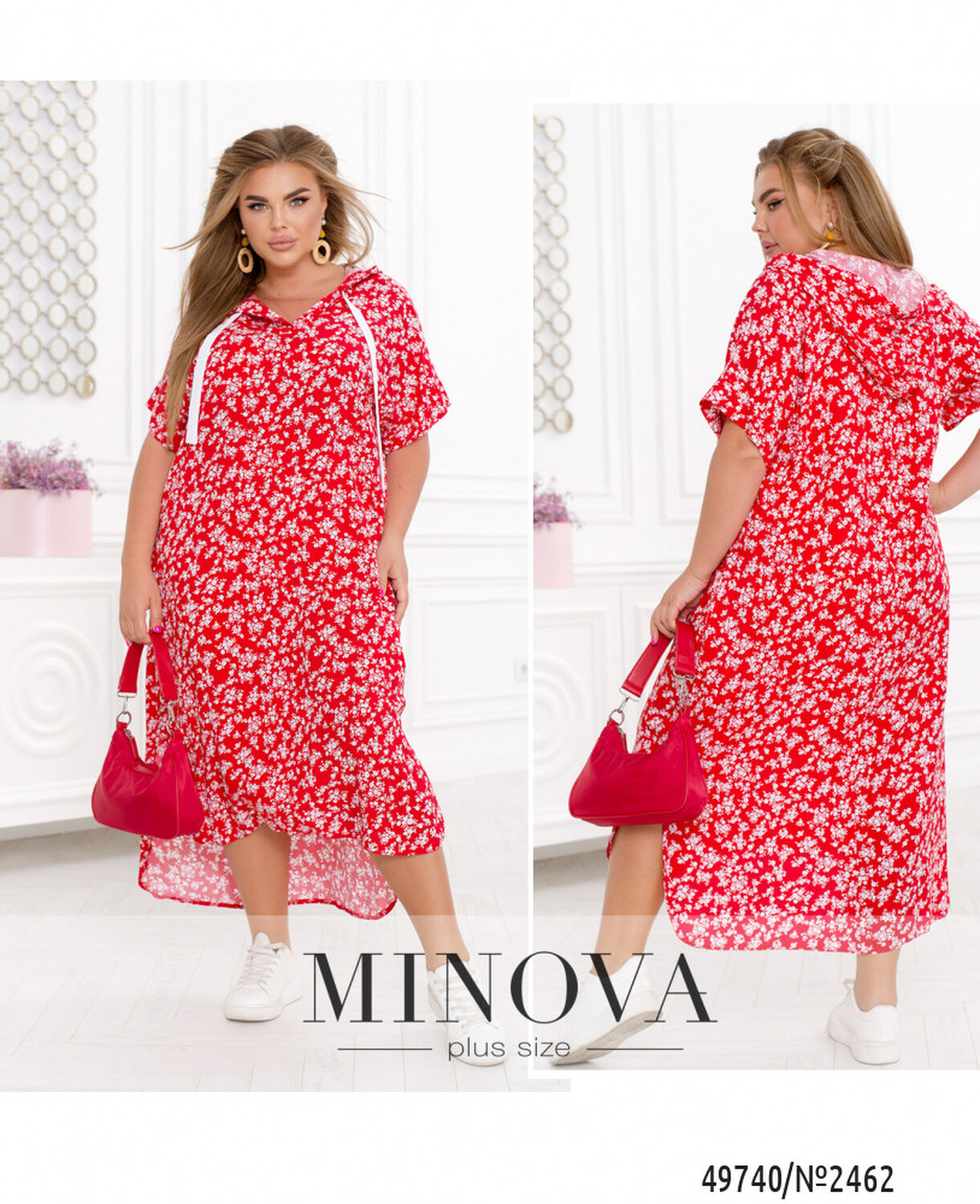 Сукня має виріз в-форми, який плавно переходить в капюшон через який проходить шнурок-стрічка. Цей елемент додає сукні оригінальності та створює додатковий акцент. Рукава спущеного крою з невеликим манжетом додають сукні легкості та свободи рухів. Сукня також має бічні кишені, що додають практичності та зручності. Поділ сукні продовжено по спинці й заокруглено, що створює ефектний вид. Бічні розрізи додають сукні додаткової свободи рухів.