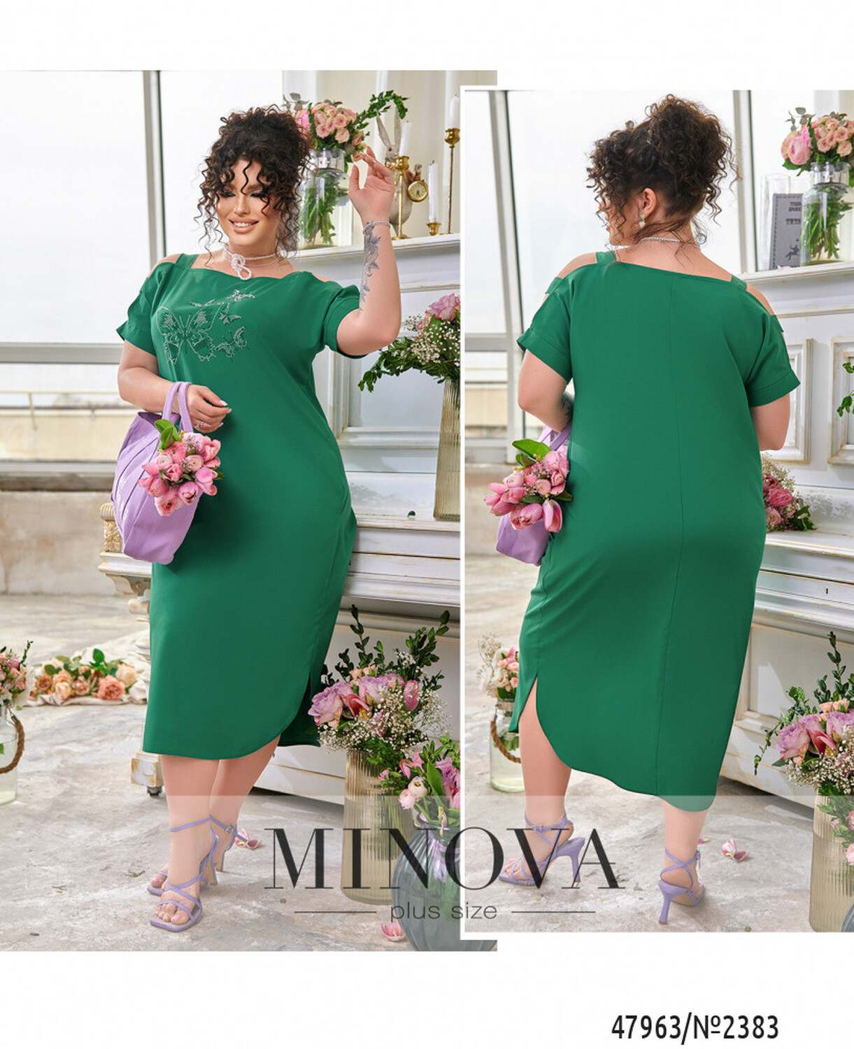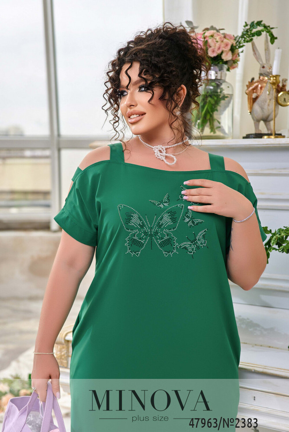 Цікава сукня з оригінальними рукавами вільного крою на манжеті. Модель довжини міді, поділ заокруглений та доповнений невеликими розрізами. В палітрі представленні як яскраві кольори, так і базові відтінки, тому ви однозначно оберете для себе ідеальний варіант. Передня частина сукні декорована метеликами у вигляді страз. В боковій частині є врізні кишені.