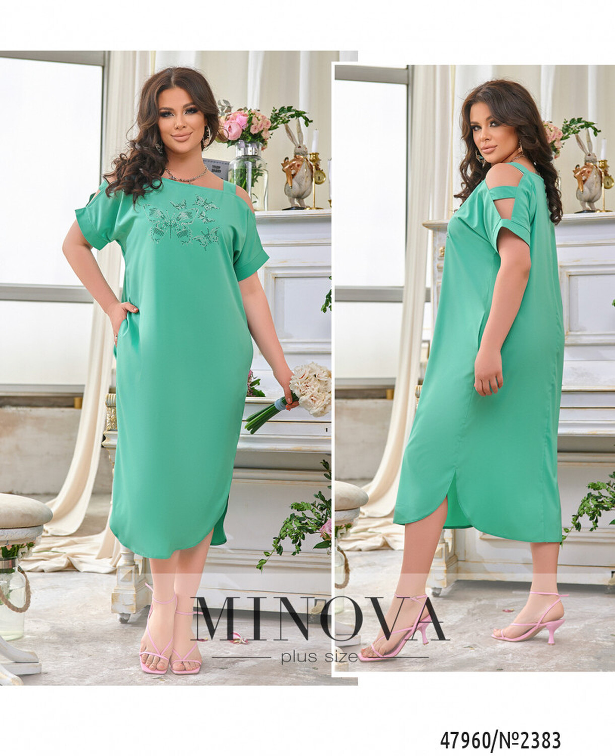 Цікава сукня з оригінальними рукавами вільного крою на манжеті. Модель довжини міді, поділ заокруглений та доповнений невеликими розрізами. В палітрі представленні як яскраві кольори, так і базові відтінки, тому ви однозначно оберете для себе ідеальний варіант. Передня частина сукні декорована метеликами у вигляді страз. В боковій частині є врізні кишені.