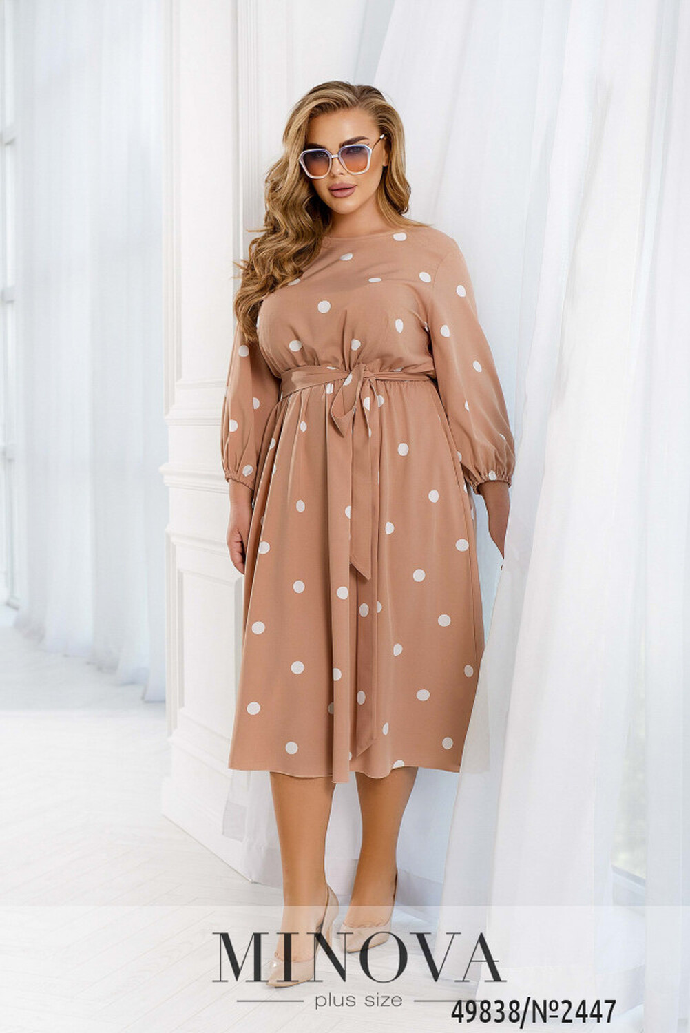 Ця жіночна сукня міді має незвичайний дизайн, який поєднує в собі елементи стилю 80-х та сучасні модні тенденції. Романтичність образу підтримує контрастний гороховий принт, що додає жіночності та легкості. Ця сукня може стати чудовим вибором для весняного або літнього образу, коли важливо виглядати свіжо та яскраво. Дизайн сукні також дозволяє легко поєднувати її з різними аксесуарами та взуттям, щоб створити унікальний образ для будь-якої події. Сукня має рукава довжиною 7/8, які доповнені гумкою, що забезпечує зручність під час руху та додає оригінальності в цілому образу. Талія відрізна, але можна доповнити пояском, який входить в комплект і надає сукні додаткової акцентованості на талії. На сукні також присутні вертикальні виточки від талії, що додають фігурність та підкреслюють жіночність. Горловина напівкругла та оброблена тонкою каймою, що надає сукні завершеності та доповнює її загальний вигляд. Загалом, ця сукня є ідеальним варіантом для тих, хто бажає виглядати стильно та елегантно, але при цьому комфортно почуватися у своєму образі. Вона може бути чудовим вибором для різних заходів — від романтичного побачення до офіційного заходу.
