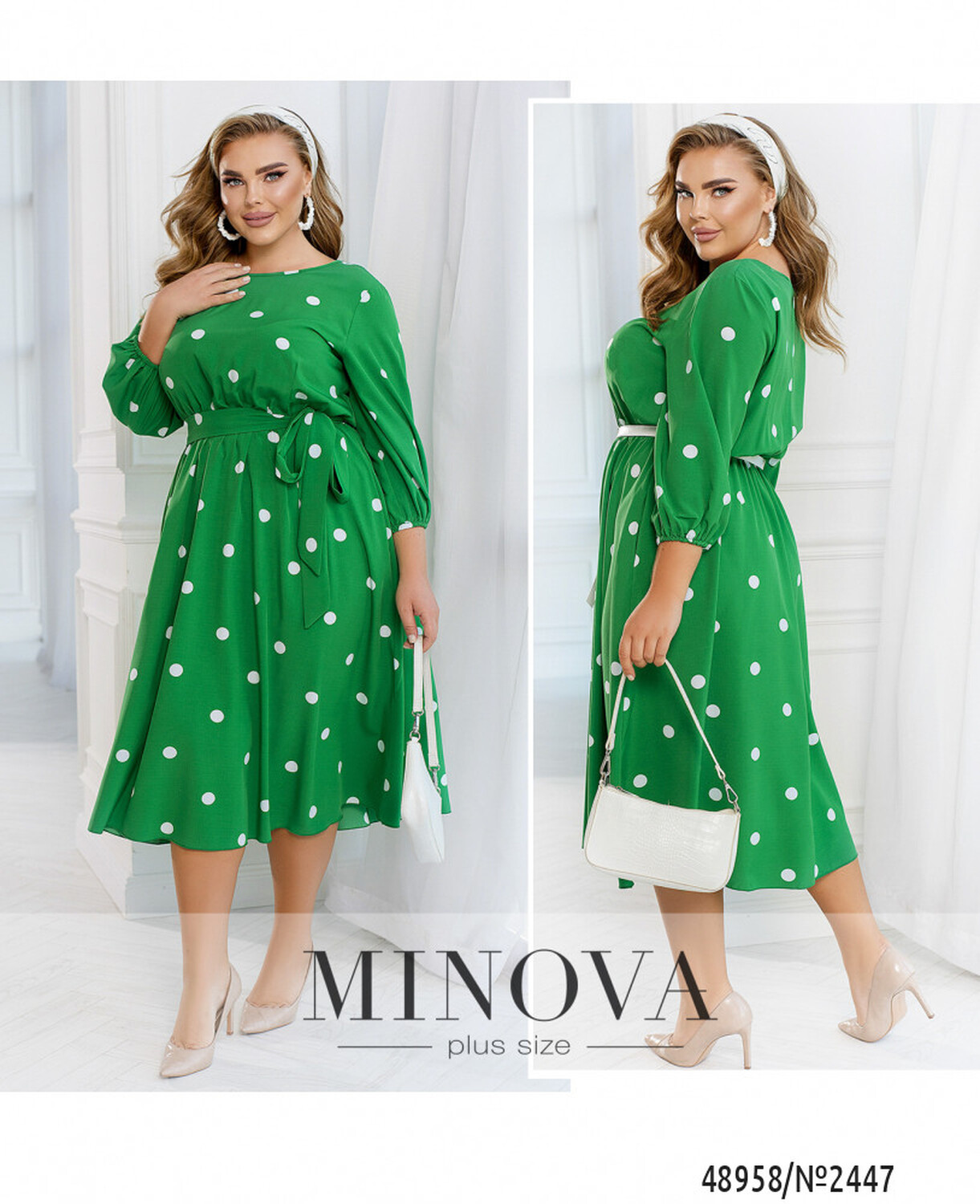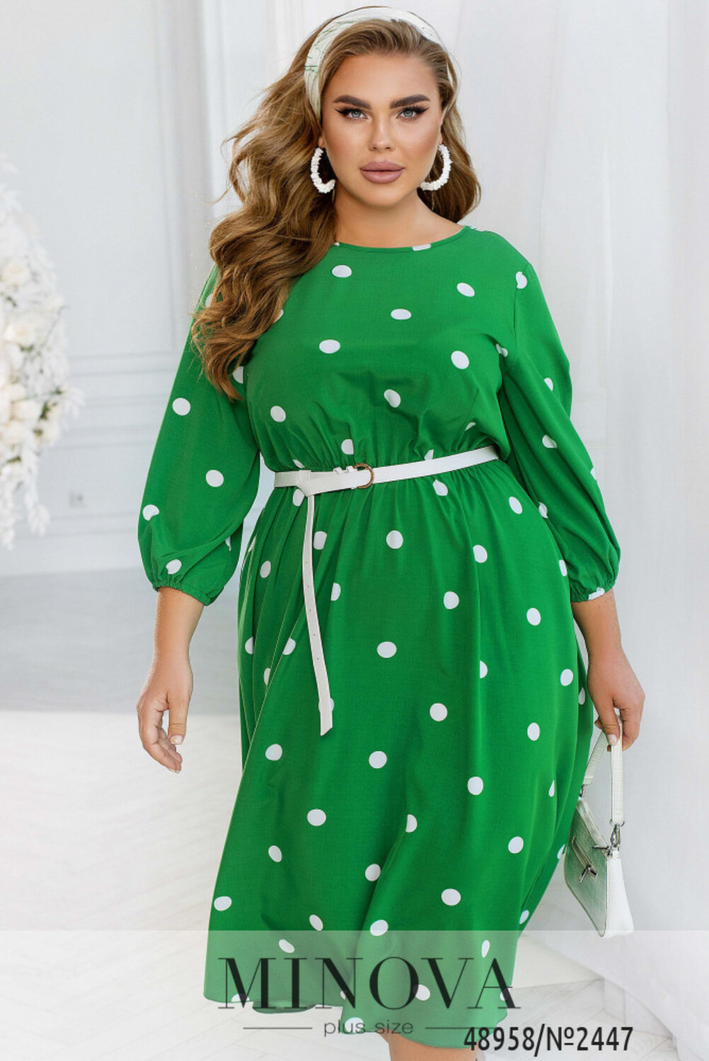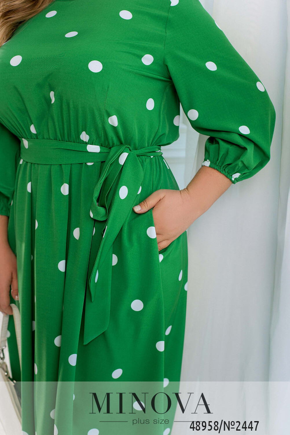 Ця жіночна сукня міді має незвичайний дизайн, який поєднує в собі елементи стилю 80-х та сучасні модні тенденції. Романтичність образу підтримує контрастний гороховий принт, що додає жіночності та легкості. Ця сукня може стати чудовим вибором для весняного або літнього образу, коли важливо виглядати свіжо та яскраво. Дизайн сукні також дозволяє легко поєднувати її з різними аксесуарами та взуттям, щоб створити унікальний образ для будь-якої події. Сукня має рукава довжиною 7/8, які доповнені гумкою, що забезпечує зручність під час руху та додає оригінальності в цілому образу. Талія відрізна, але можна доповнити пояском, який входить в комплект і надає сукні додаткової акцентованості на талії. На сукні також присутні вертикальні виточки від талії, що додають фігурність та підкреслюють жіночність. Горловина напівкругла та оброблена тонкою каймою, що надає сукні завершеності та доповнює її загальний вигляд. Загалом, ця сукня є ідеальним варіантом для тих, хто бажає виглядати стильно та елегантно, але при цьому комфортно почуватися у своєму образі. Вона може бути чудовим вибором для різних заходів — від романтичного побачення до офіційного заходу.