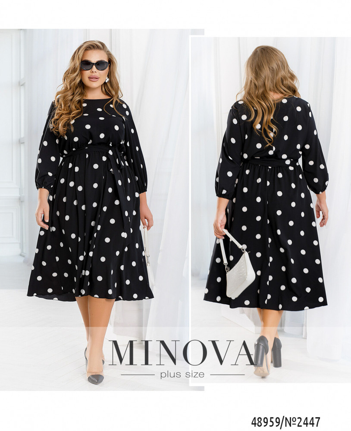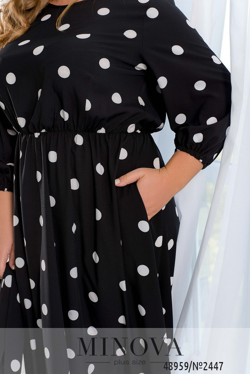 Ця жіночна сукня міді має незвичайний дизайн, який поєднує в собі елементи стилю 80-х та сучасні модні тенденції. Романтичність образу підтримує контрастний гороховий принт, що додає жіночності та легкості. Ця сукня може стати чудовим вибором для весняного або літнього образу, коли важливо виглядати свіжо та яскраво. Дизайн сукні також дозволяє легко поєднувати її з різними аксесуарами та взуттям, щоб створити унікальний образ для будь-якої події. Сукня має рукава довжиною 7/8, які доповнені гумкою, що забезпечує зручність під час руху та додає оригінальності в цілому образу. Талія відрізна, але можна доповнити пояском, який входить в комплект і надає сукні додаткової акцентованості на талії. На сукні також присутні вертикальні виточки від талії, що додають фігурність та підкреслюють жіночність. Горловина напівкругла та оброблена тонкою каймою, що надає сукні завершеності та доповнює її загальний вигляд. Загалом, ця сукня є ідеальним варіантом для тих, хто бажає виглядати стильно та елегантно, але при цьому комфортно почуватися у своєму образі. Вона може бути чудовим вибором для різних заходів — від романтичного побачення до офіційного заходу.