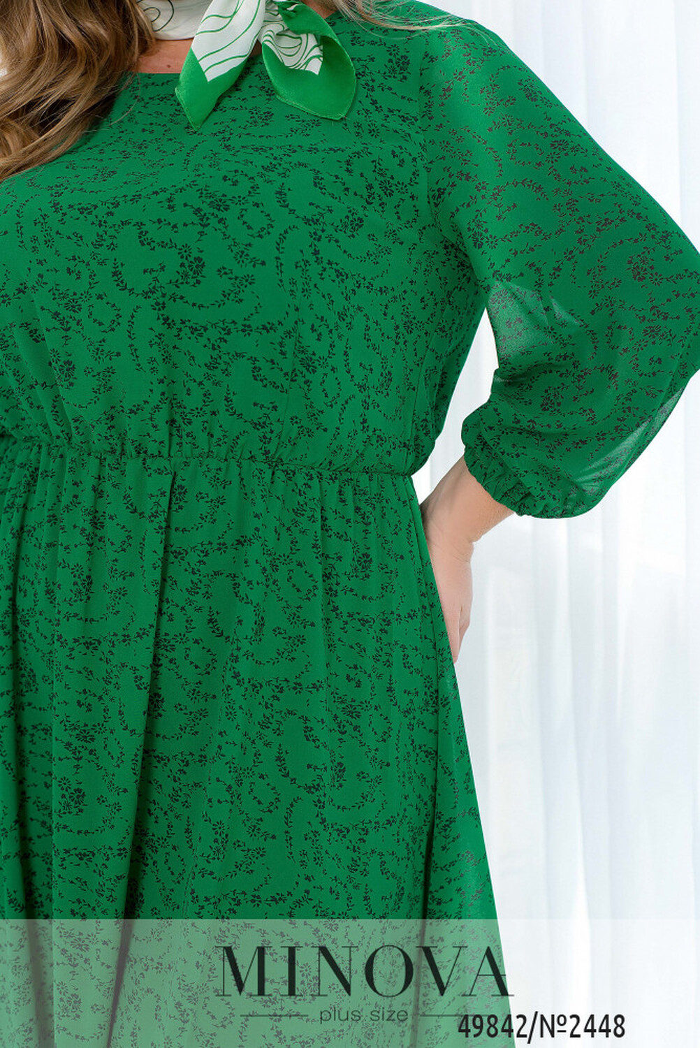 Ця повітряна сукня зроблена з легкого шифону у квітковий принт. Вона має півкруглий виріз горловини та відрізну лінію талії з резинкою, яка спадає плісованими оборками, надаючи сукні легкості та грації. Сукня складається з двох шарів тканини, де верхній шар є напівпрозорим шифоном, а нижній шар м'який та приємний на дотик. Рукава сукні довжиною 3/4 не мають підкладки, що забезпечує її легкість та повітряність. На зап'ястках рукавів вшиті резинки, що додає сукні об'єму та елегантності. Талія відрізна з вертикальними виточками, які підкреслюють жіночність фігури та надають сукні додаткового орнаменту. А обрамити талію можна пояском, який входить в комплект.