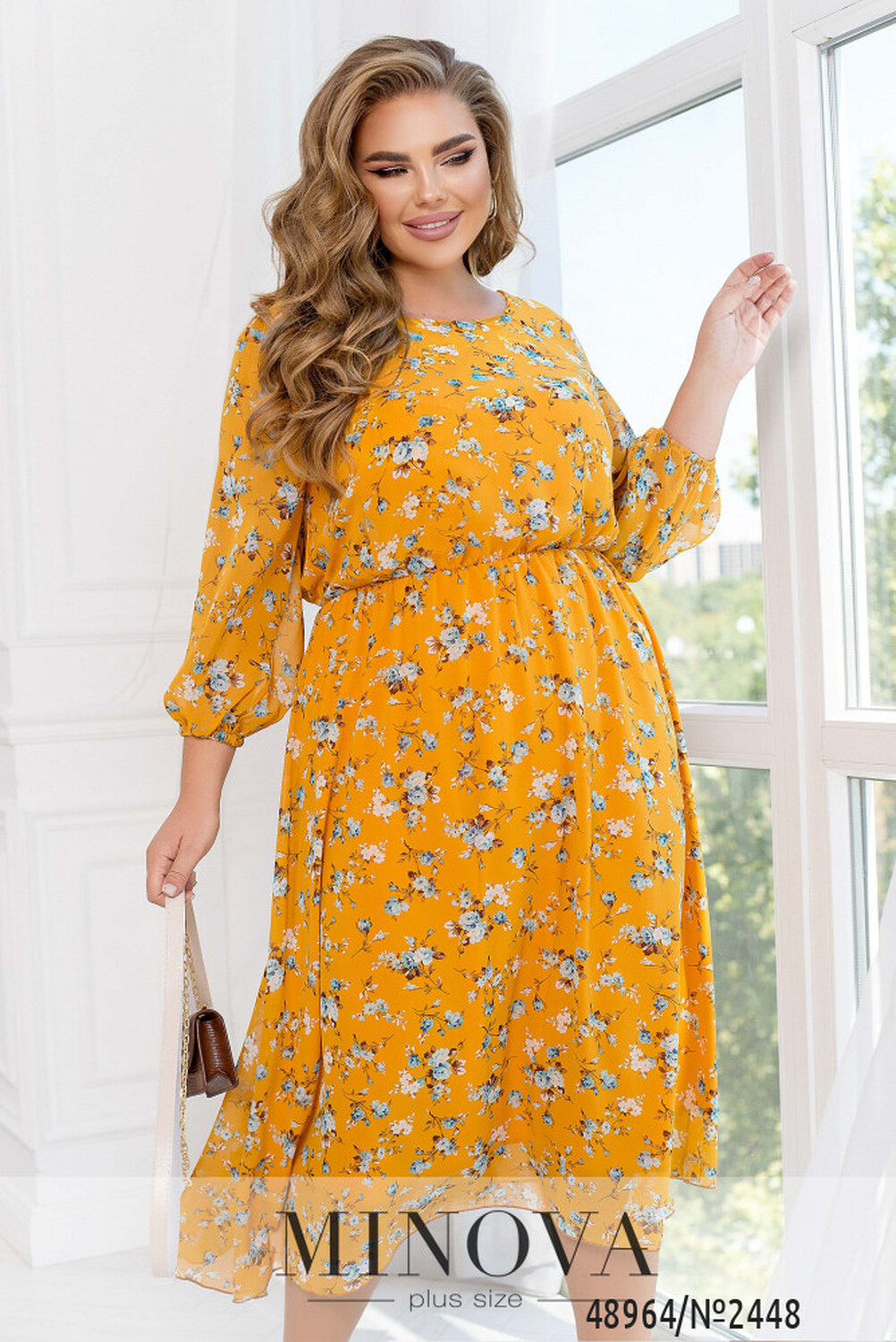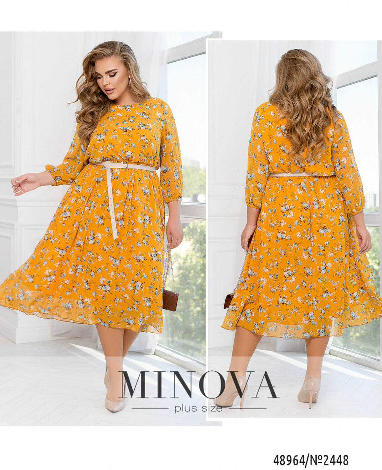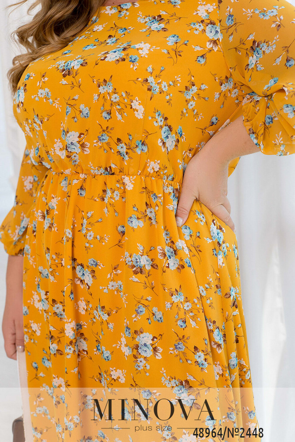 Ця повітряна сукня зроблена з легкого шифону у квітковий принт. Вона має півкруглий виріз горловини та відрізну лінію талії з резинкою, яка спадає плісованими оборками, надаючи сукні легкості та грації. Сукня складається з двох шарів тканини, де верхній шар є напівпрозорим шифоном, а нижній шар м'який та приємний на дотик. Рукава сукні довжиною 3/4 не мають підкладки, що забезпечує її легкість та повітряність. На зап'ястках рукавів вшиті резинки, що додає сукні об'єму та елегантності. Талія відрізна з вертикальними виточками, які підкреслюють жіночність фігури та надають сукні додаткового орнаменту. А обрамити талію можна пояском, який входить в комплект.