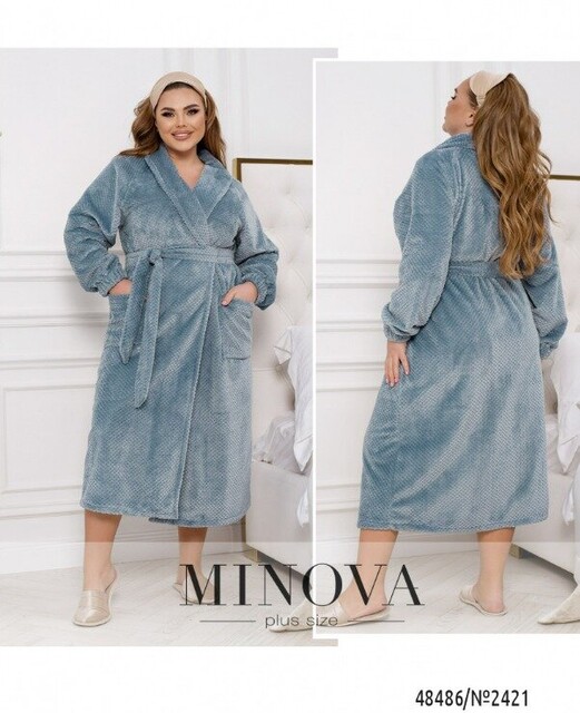 66-68 р-р: довжина халата 124см, довжина рукава від горловини 79см, обхват рукава 54см, ОГ - 156см, ОТ -156см, OC -160см.