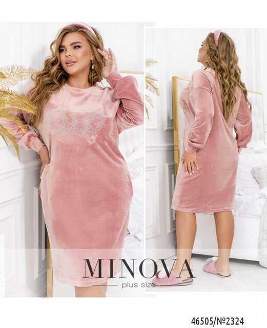 Яскрава однотонна домашня сукня, виконана з м'якого велюру, виглядає по-справжньому шикарно, і разом з тим відчувається комфортно для будь — яких домашніх справ - від прибирання до ігор з дітьми. Модель з довгими рукавами доповнена кишенями в бічних швах і прикрашена декоративною аплікацією на грудях.