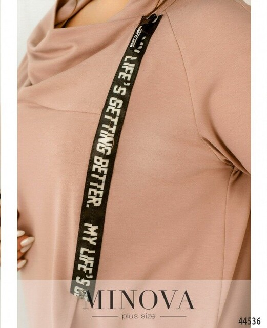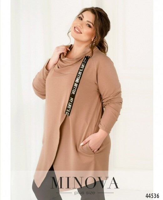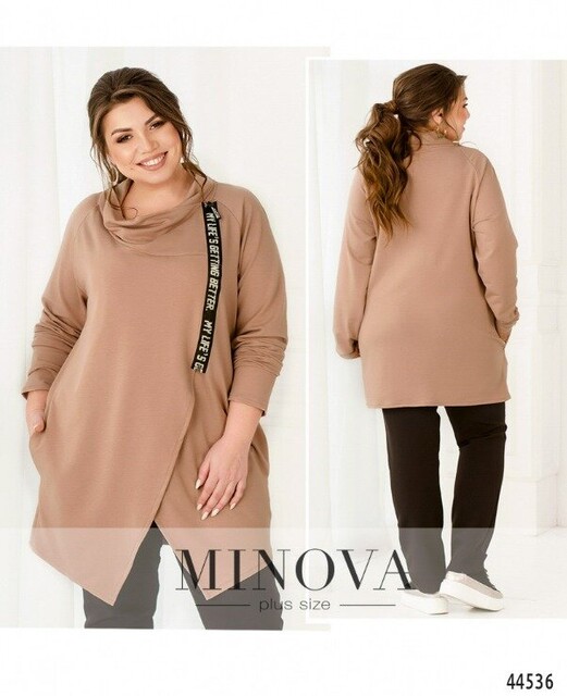 Елегантна та оригінальна туніка батал, застібається на запин, на один гудзик зсередини та на діагональну блискавку ззовні. Блискавка прикрашена декоративною стрічкою. Рукава без манжетів, підкладки немає, з боків - кишені в шві.