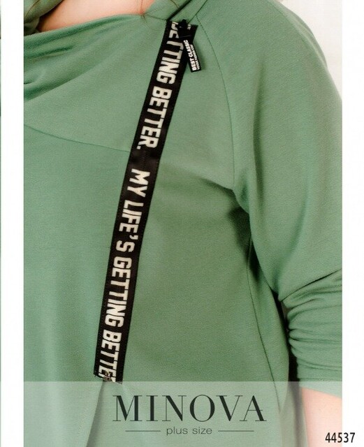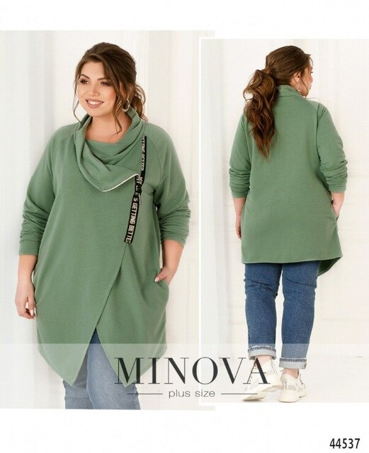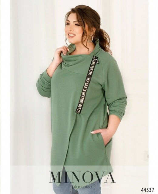 Елегантна та оригінальна туніка батал, застібається на запин, на один гудзик зсередини та на діагональну блискавку ззовні. Блискавка прикрашена декоративною стрічкою. Рукава без манжетів, підкладки немає, з боків - кишені в шві.