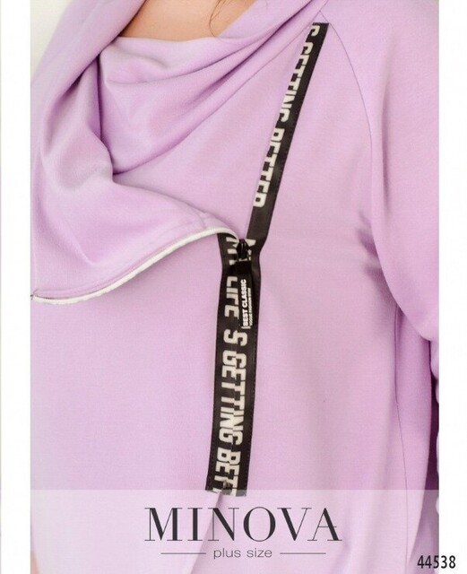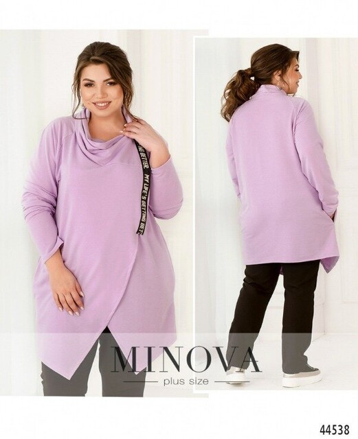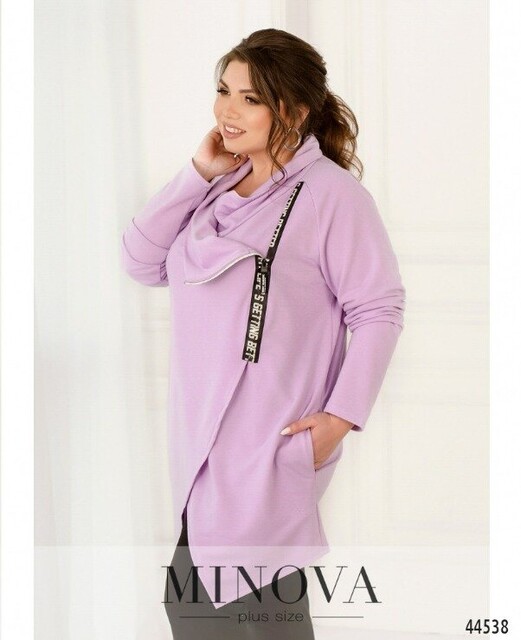Елегантна та оригінальна туніка батал, застібається на запин, на один гудзик зсередини та на діагональну блискавку ззовні. Блискавка прикрашена декоративною стрічкою. Рукава без манжетів, підкладки немає, з боків - кишені в шві.
