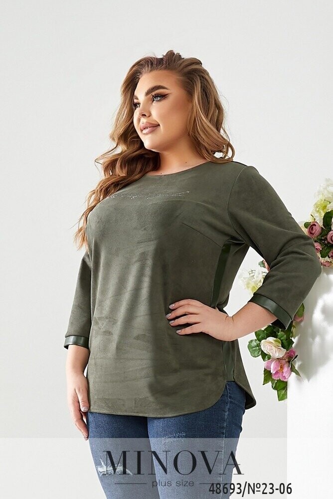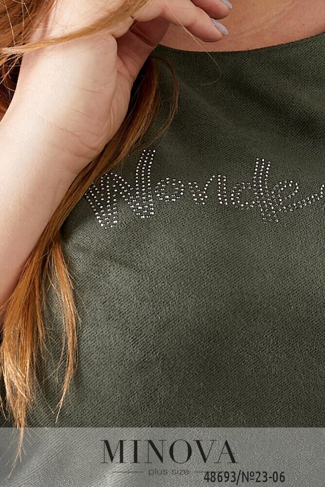 Замшева кофтинка, яка буде легко комбінуватись в базових образах. Кофта доповнена вставками у вигляді екошкіри по бокових швах, а також на рукавах у вигляді манжету. Низ кофтинки заокруглено, а на грудях декоративний надпис "Wonderful" у вигляді страз.