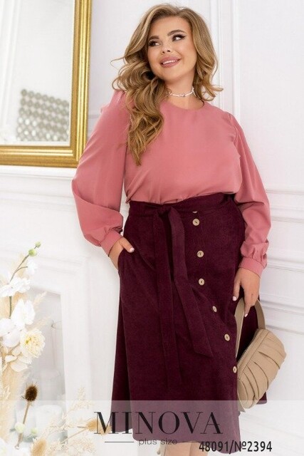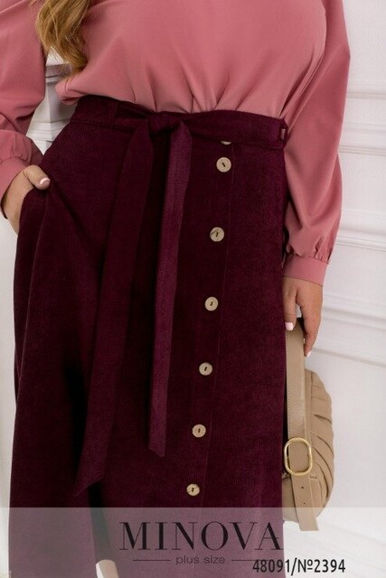 Лаконічна та легка спідниця А-силуету з легкого вельвету. Тканина має цікаву фактуру, приємна на дотик і в наш час дуже актуальна. По передній частині планка з ґудзиками по всій довжині. На талії є шлейки та пасок для підкреслення лінії талії, а по спинці розташована резинка, яка додасть додаткового комфорту, а по бокам є кармани.