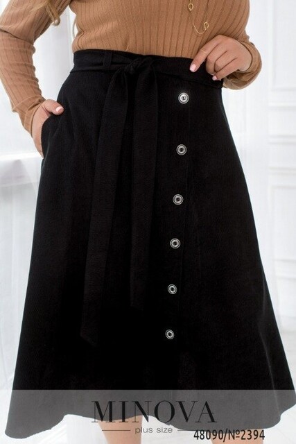 Лаконічна та легка спідниця А-силуету з легкого вельвету. Тканина має цікаву фактуру, приємна на дотик і в наш час дуже актуальна. По передній частині планка з ґудзиками по всій довжині. На талії є шлейки та пасок для підкреслення лінії талії, а по спинці розташована резинка, яка додасть додаткового комфорту, а по бокам є кармани.