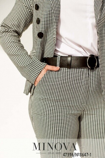 Класичний діловий костюм здатний надати контурам фігури м'якості та природності. Укорочений жакет без підкладки, доповнений кишенями з накладними клапанами і коміром з лацканами, застібається на гудзик спереду. Комплект доповнений класичними брюками з кишенями, що застібаються на змійку та ґудзик спереду.