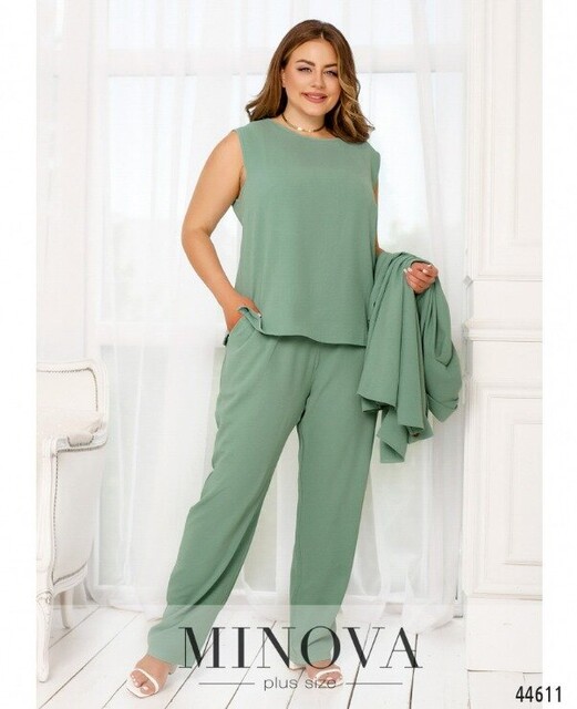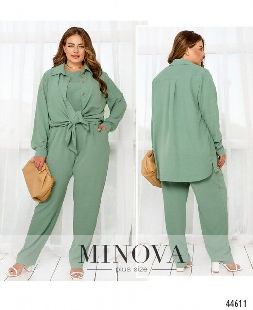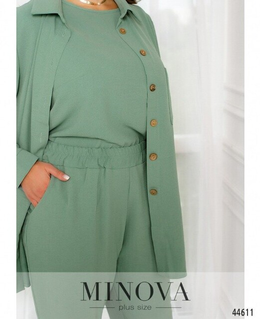 Елегантний та стильний костюм трійка великого розміру. Верхня сорочка подовжена, з відкладним комірцем, на грудях накладна кишеня, з боків - довгі розрізи. На рукавах манжети, на манжетах по одному гудзику. Брюки з високою талією, з боків - кишені в шві, до поясу вшито резинку. Майка з півкруглим вирізом горловини, на грудях виточки, з боків подолу - розрізи. Без кишень і застібок.