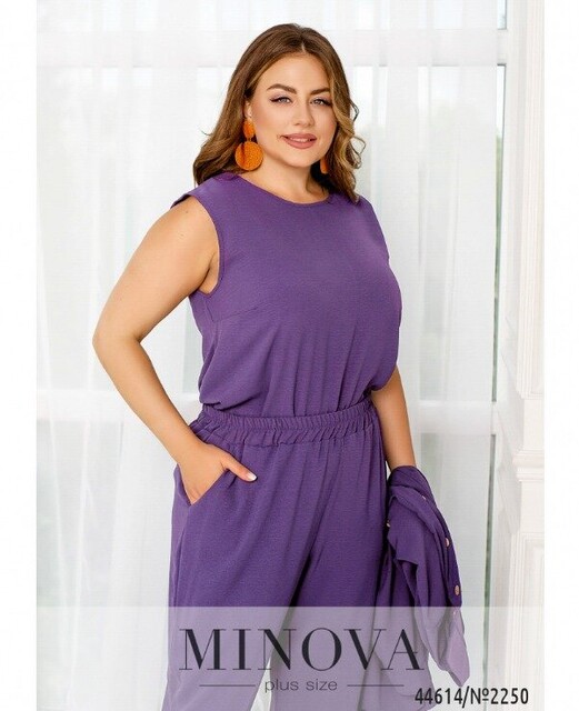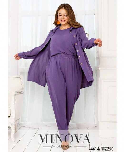 Елегантний та стильний костюм трійка великого розміру. Верхня сорочка подовжена, з відкладним комірцем, на грудях накладна кишеня, з боків - довгі розрізи. На рукавах манжети, на манжетах по одному гудзику. Брюки з високою талією, з боків - кишені в шві, до поясу вшито резинку. Майка з півкруглим вирізом горловини, на грудях виточки, з боків подолу - розрізи. Без кишень і застібок.