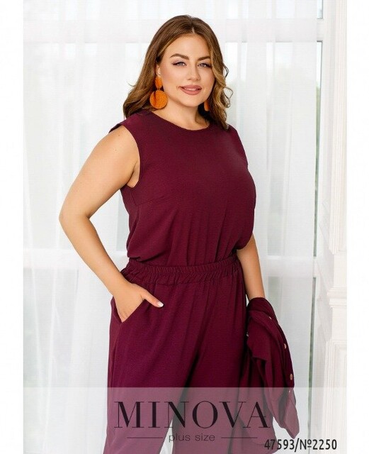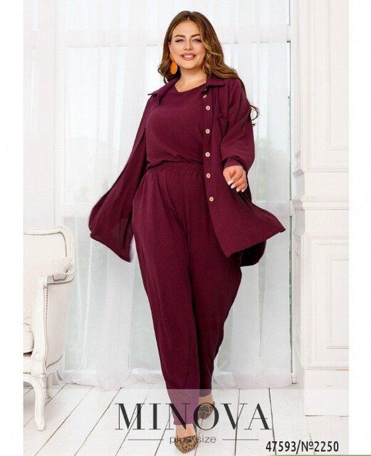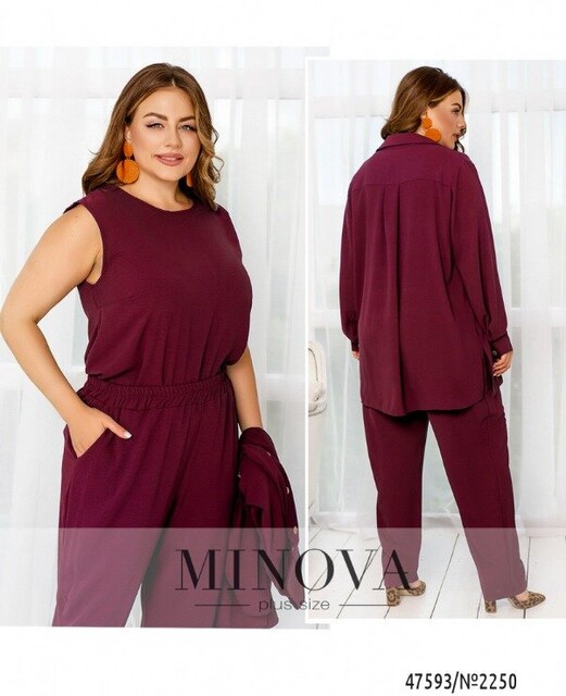 Елегантний та стильний костюм трійка великого розміру. Верхня сорочка подовжена, з відкладним комірцем, на грудях накладна кишеня, з боків - довгі розрізи. На рукавах манжети, на манжетах по одному гудзику. Брюки з високою талією, з боків - кишені в шві, до поясу вшито резинку. Майка з півкруглим вирізом горловини, на грудях виточки, з боків подолу - розрізи. Без кишень і застібок.