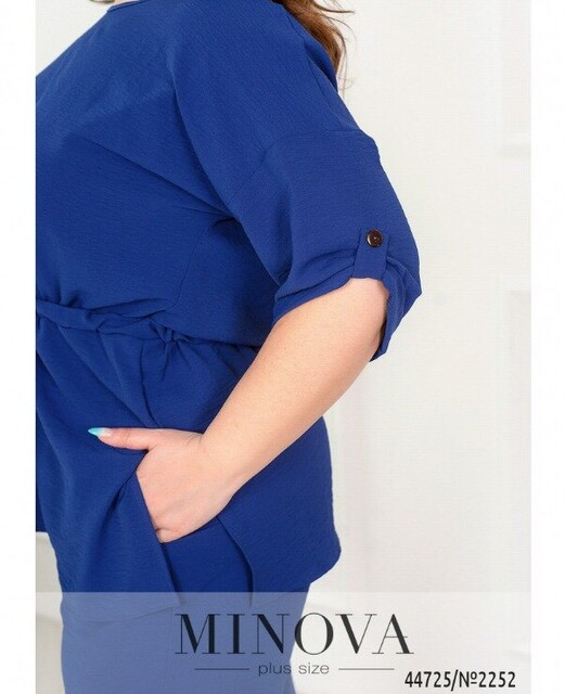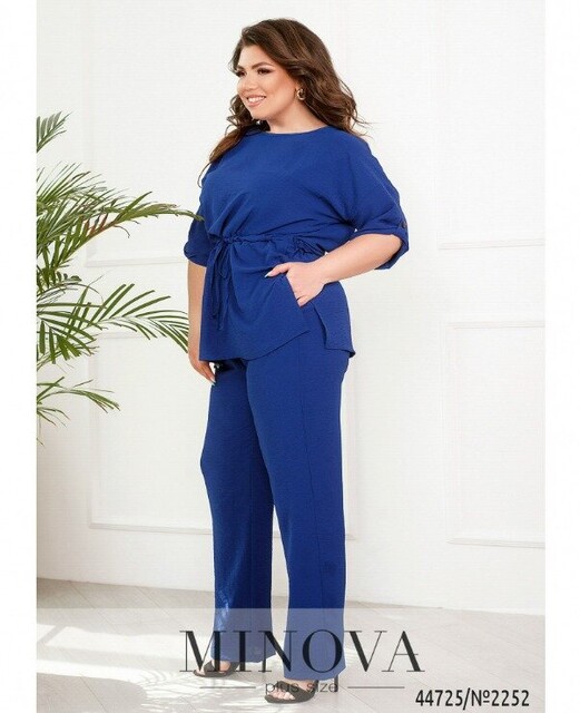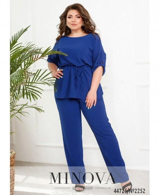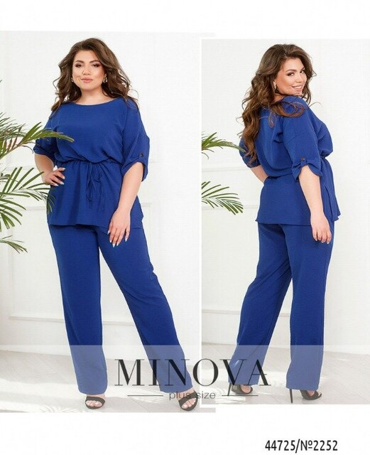 Мінімалістичний костюм батал, футболка без застібок та кишень, через талію під куліскою пропущено шнурок, з боків подолу - розрізи. Виріз горловини півкруглий. На рукавах невеликі відвороти. Брюки з високою талією, до поясу вшито резинку, з боків - кишені в шві.