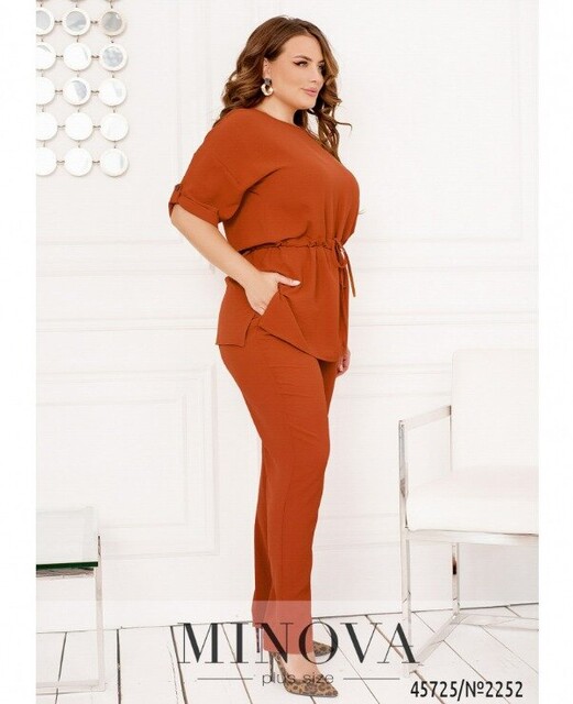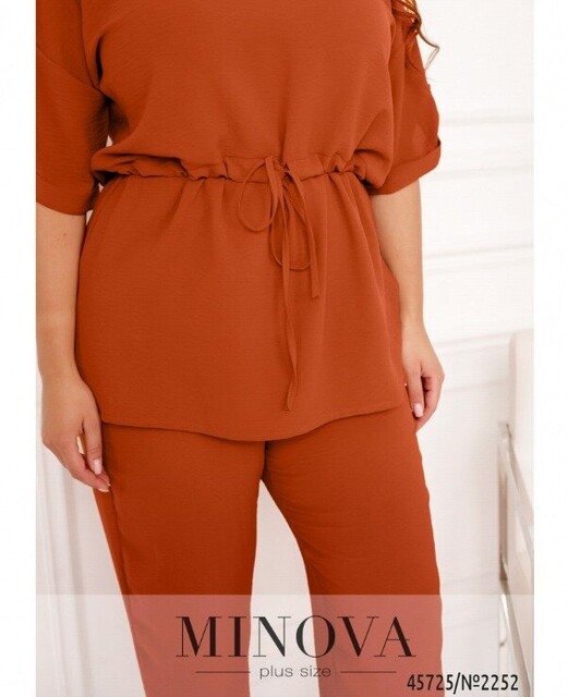 Мінімалістичний костюм батал, футболка без застібок та кишень, через талію під куліскою пропущено шнурок, з боків подолу - розрізи. Виріз горловини півкруглий. На рукавах невеликі відвороти. Брюки з високою талією, до поясу вшито резинку, з боків - кишені в шві.
