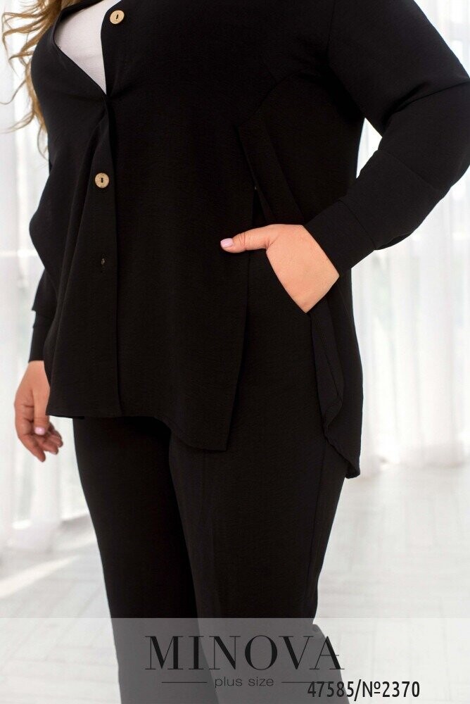 Стильний монохромний костюм, що виконаний з легкої жатой тканини, добре сідає по фігурі, незалежно від її особливостей. У комплект входять лаконічні штани на резинці з кишенями і виразна блуза в тон, що доповнена відкладним коміром, довгими рукавами з манжетами і функціональними гудзиками спереду на планці. Родзинкою цієї блузи є розрізи з боків спереду, що розпахуються і роблять її ще більш повітряної і невагомою.