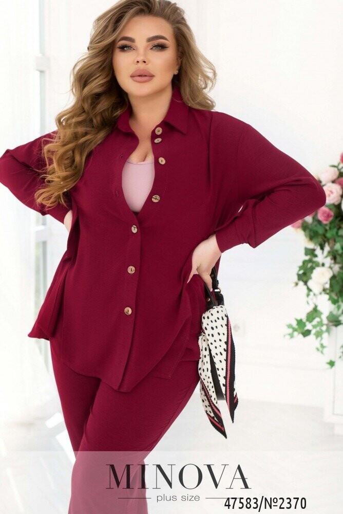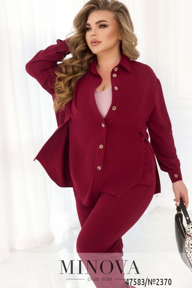 Стильний монохромний костюм, що виконаний з легкої жатой тканини, добре сідає по фігурі, незалежно від її особливостей. У комплект входять лаконічні штани на резинці з кишенями і виразна блуза в тон, що доповнена відкладним коміром, довгими рукавами з манжетами і функціональними гудзиками спереду на планці. Родзинкою цієї блузи є розрізи з боків спереду, що розпахуються і роблять її ще більш повітряної і невагомою.
