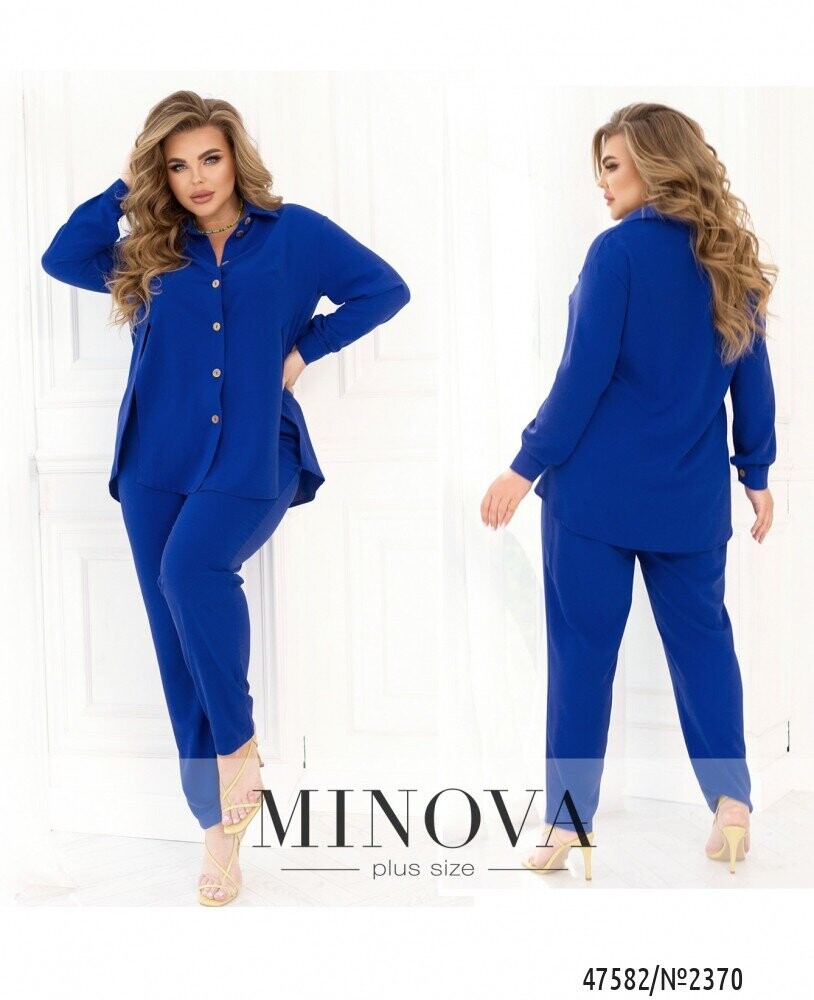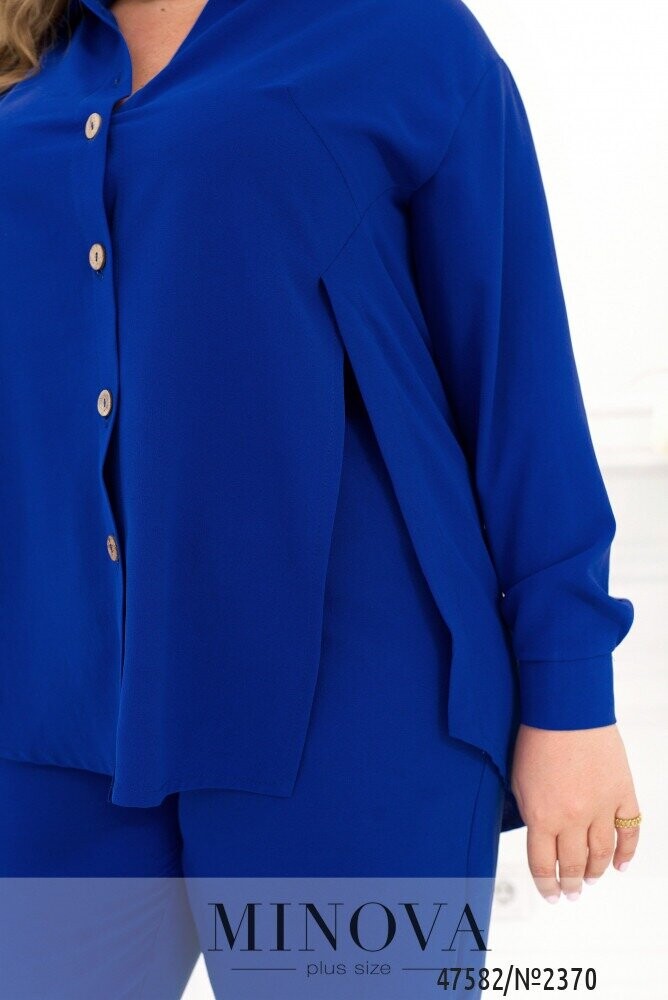 Стильний монохромний костюм, що виконаний з легкої жатой тканини, добре сідає по фігурі, незалежно від її особливостей. У комплект входять лаконічні штани на резинці з кишенями і виразна блуза в тон, що доповнена відкладним коміром, довгими рукавами з манжетами і функціональними гудзиками спереду на планці. Родзинкою цієї блузи є розрізи з боків спереду, що розпахуються і роблять її ще більш повітряної і невагомою.