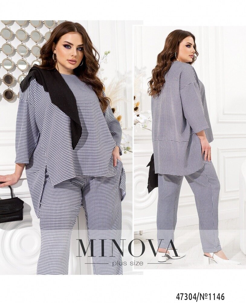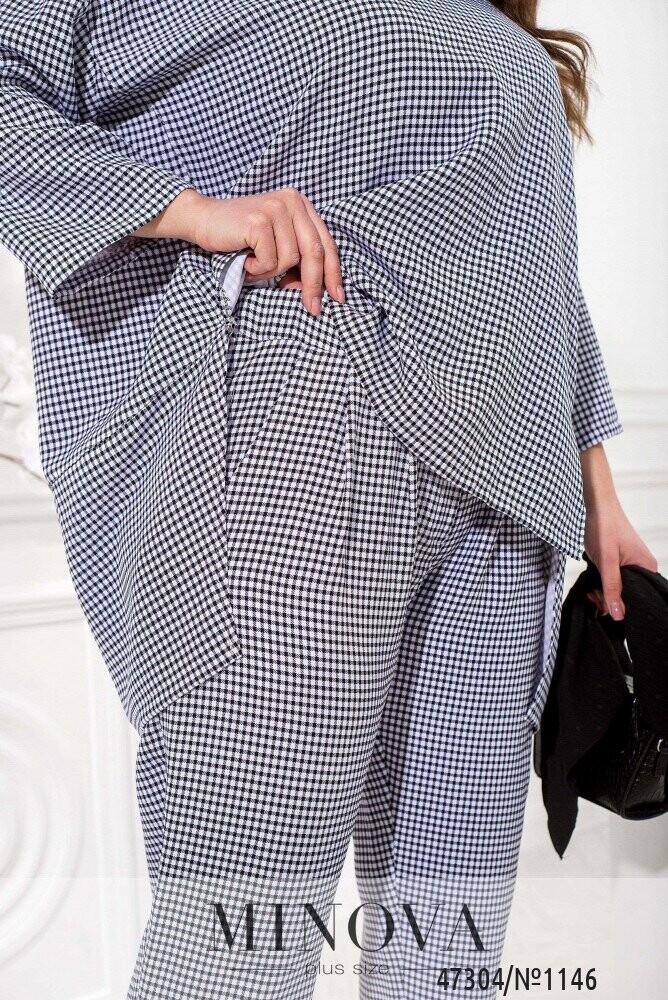 Жіночний костюм з актуальним принтом в клітинку можна вписати в діловий стиль, якщо ваш робочий дрес-код не надто консервативний. Він складається з лаконічних штанів на резинці і блузи актуальної форми oversize. Штани звуженої форми з манжетами доповнені защипами спереду і кишенями з боків. Блуза вільного крою звертає на себе увагу завдяки приспущеній лінії плечей і асиметричному подолу з розрізами.