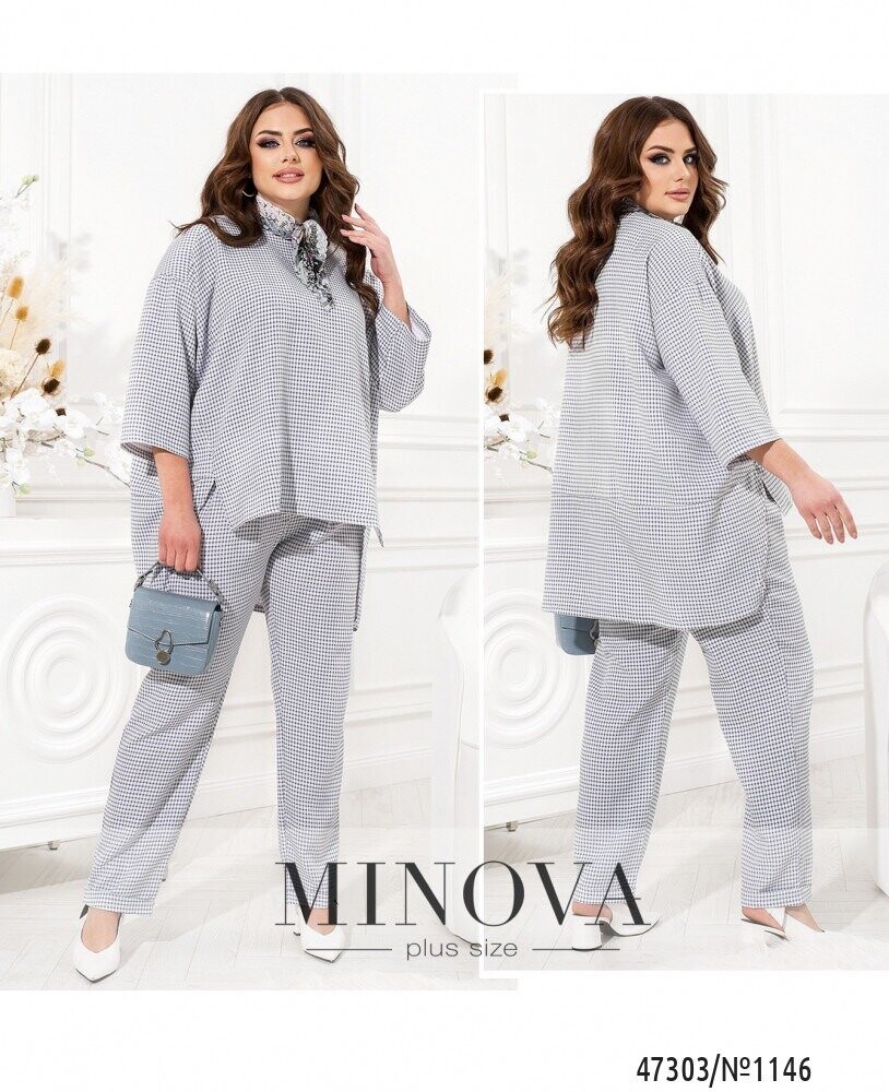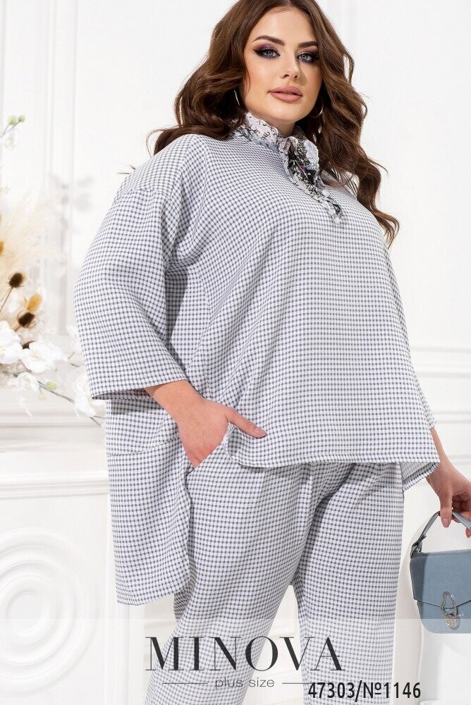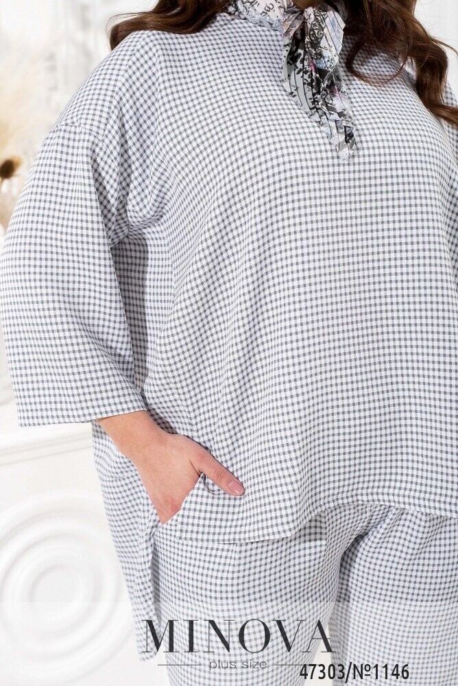 Жіночний костюм з актуальним принтом в клітинку можна вписати в діловий стиль, якщо ваш робочий дрес-код не надто консервативний. Він складається з лаконічних штанів на резинці і блузи актуальної форми oversize. Штани звуженої форми з манжетами доповнені защипами спереду і кишенями з боків. Блуза вільного крою звертає на себе увагу завдяки приспущеній лінії плечей і асиметричному подолу з розрізами.