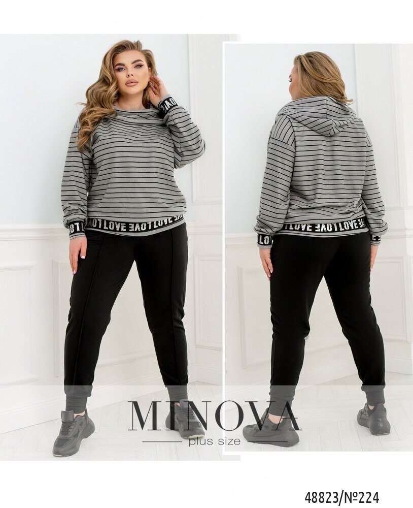 Зручний та комфортний костюм в повсякденному стилі. М'який светр в актуальний принт в полоску з широкою горловиною. Рукава приспущеного крою з декоративним манжетом-резинкою. Стильно виглядає в повсякденних образах та легко поєднується з будь-яким низом. Завдяки цікавому акценту у вигляді гумки на рукавах та подолі виглядає більш стильно та сучасно. Штани з нашитою "стрілкою" спереду по центру. До манжетів внизу вшито гумку з боків - кишені у шві.