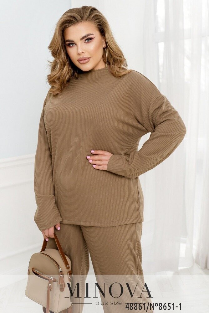 Цей стильний костюм з трикотажу в рубчик — ідеальний вибір для створення модних весняних образів та отримання приємних відчуттів від носіння. Кофта має оверсайз крій зі спущеною лінією плечей та цільнокроєною горловиною. Вона подовжена і по низу по боках має невеликі розрізи, що додає костюму оригінальності. Штани-палаццо мають широкий крій без кишень і резинку на талії для комфортного носіння. Такий костюм стане незамінним в гардеробі та дозволить Вам виглядати модно і відчувати себе затишно в будь-який час дня.