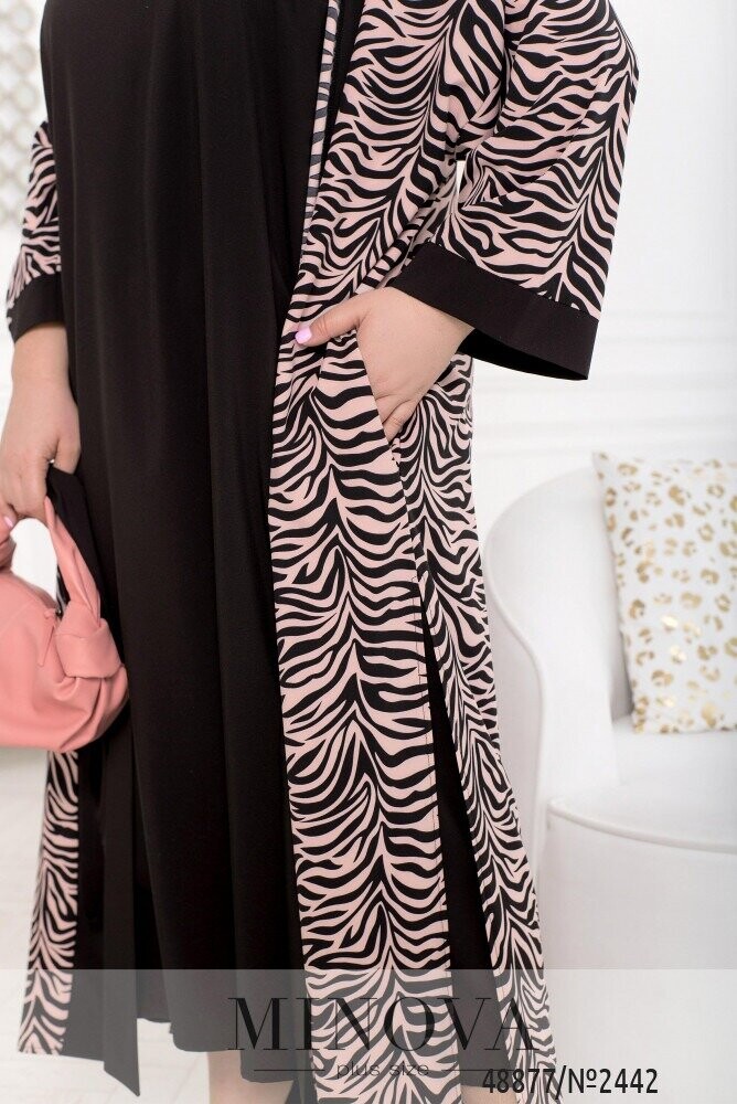 Пропонуємо до вашої уваги жіночний костюм, який є ідеальним варіантом для літніх та весняних днів завдяки своєму вільному фасону та легким тканинам. Костюм складається з лаконічної однотонної сукні А-силуету з V-подібним вирізом горловини, що доповнюється повітряним невагомим кардиганом. Кардиган виконаний з напівпрозорого шифону та має широкі рукава з манжетами в тон сукні, карманами в бічних швах та розрізами з боків., які додадуть легкості та повітряності в образ. Кардиган не має застібок, а фіксується текстильним поясом, який входить в комплект.