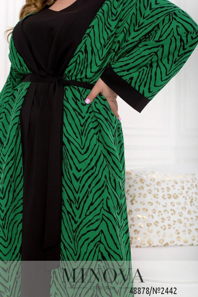 Пропонуємо до вашої уваги жіночний костюм, який є ідеальним варіантом для літніх та весняних днів завдяки своєму вільному фасону та легким тканинам. Костюм складається з лаконічної однотонної сукні А-силуету з V-подібним вирізом горловини, що доповнюється повітряним невагомим кардиганом. Кардиган виконаний з напівпрозорого шифону та має широкі рукава з манжетами в тон сукні, карманами в бічних швах та розрізами з боків., які додадуть легкості та повітряності в образ. Кардиган не має застібок, а фіксується текстильним поясом, який входить в комплект.