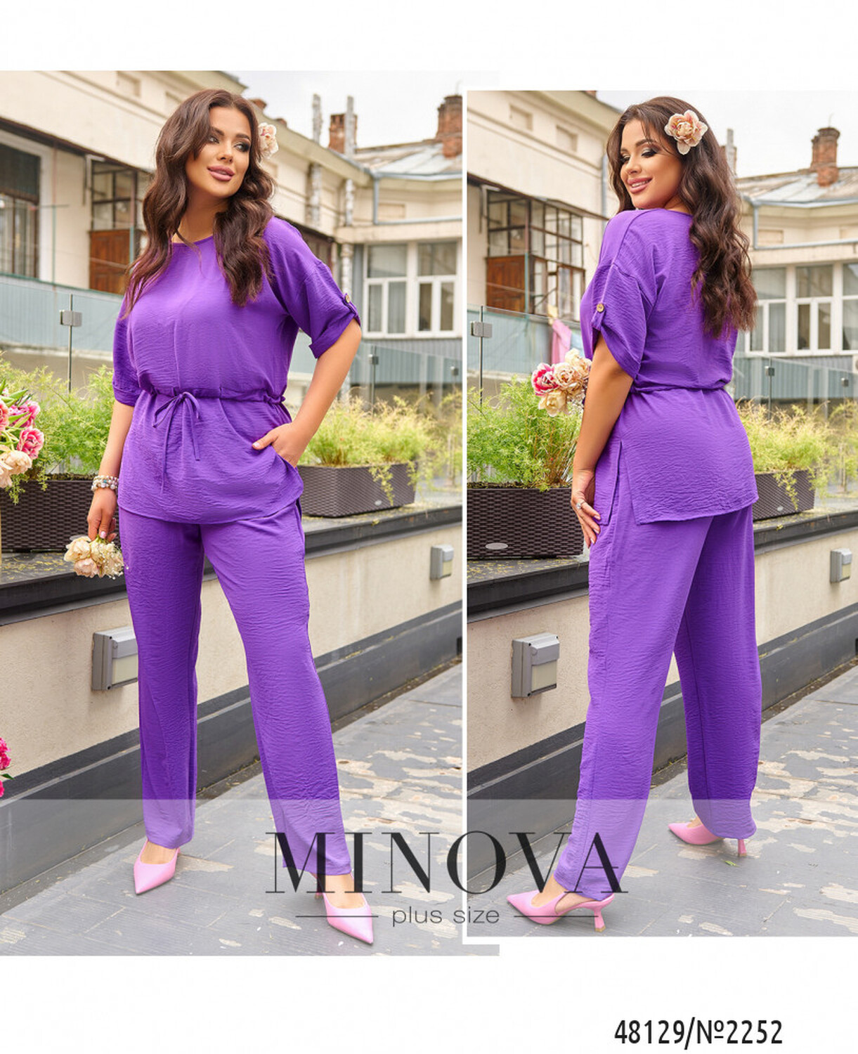 Мінімалістичний костюм батал, футболка без застібок та кишень, через талію під куліскою пропущено шнурок, з боків подолу - розрізи. Виріз горловини півкруглий. На рукавах невеликі відвороти. Брюки з високою талією, до поясу вшито резинку, з боків - кишені в шві.