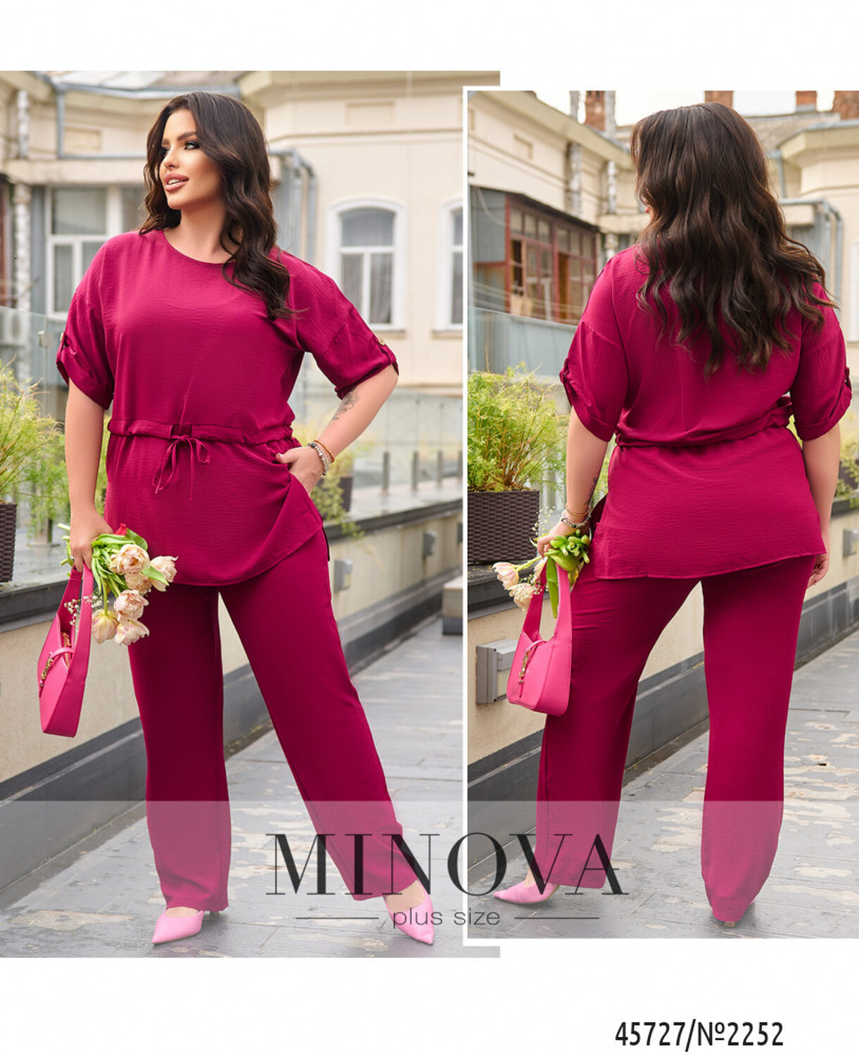 Мінімалістичний костюм батал, футболка без застібок та кишень, через талію під куліскою пропущено шнурок, з боків подолу - розрізи. Виріз горловини півкруглий. На рукавах невеликі відвороти. Брюки з високою талією, до поясу вшито резинку, з боків - кишені в шві.