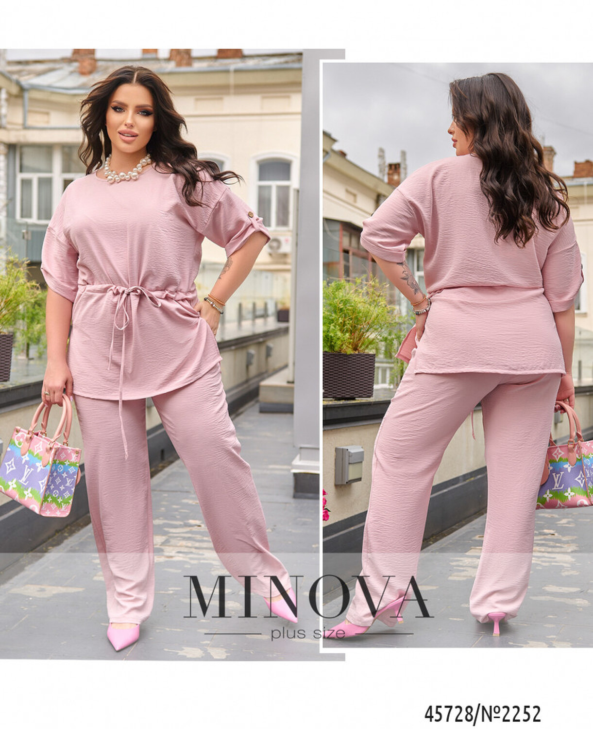 Мінімалістичний костюм батал, футболка без застібок та кишень, через талію під куліскою пропущено шнурок, з боків подолу - розрізи. Виріз горловини півкруглий. На рукавах невеликі відвороти. Брюки з високою талією, до поясу вшито резинку, з боків - кишені в шві.