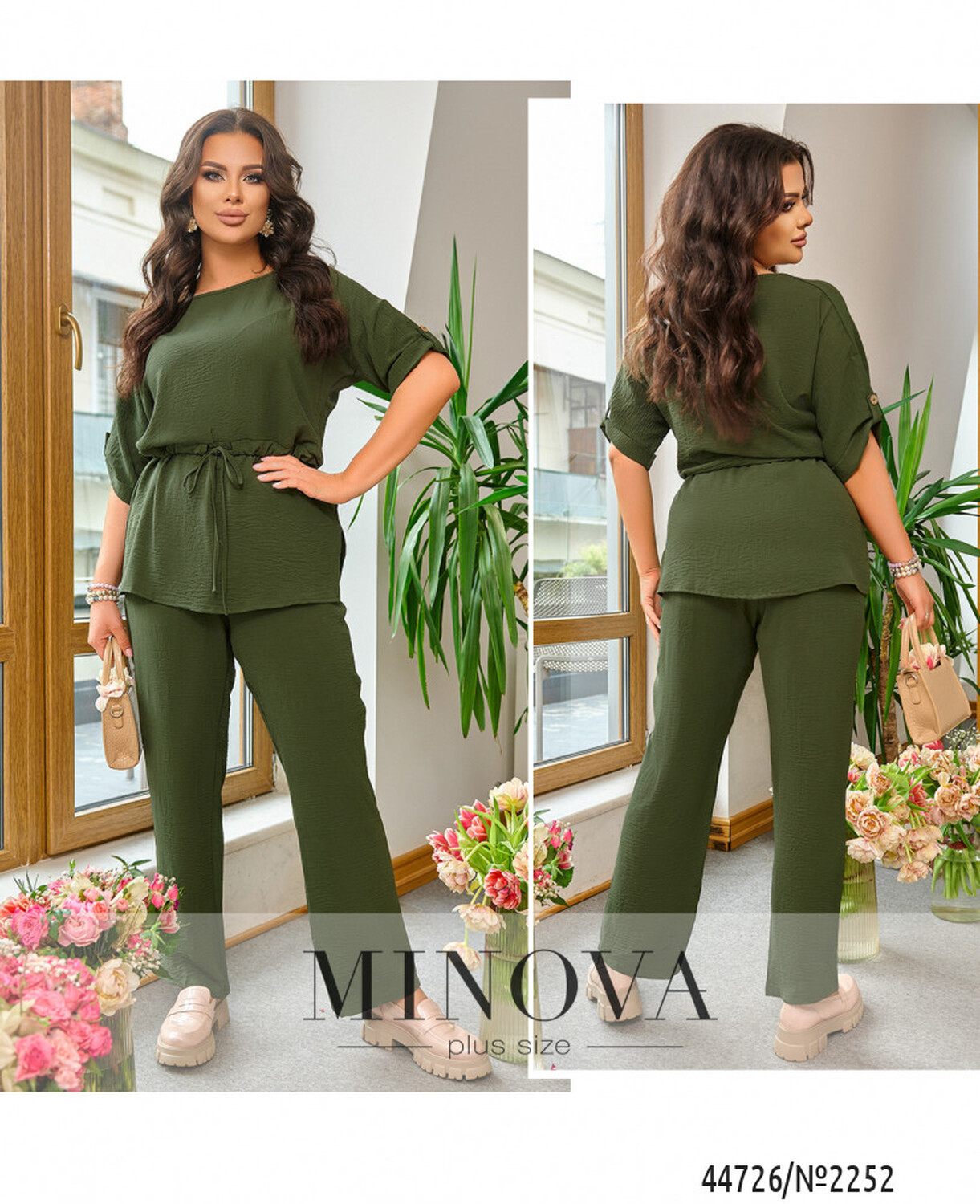 Мінімалістичний костюм батал, футболка без застібок та кишень, через талію під куліскою пропущено шнурок, з боків подолу - розрізи. Виріз горловини півкруглий. На рукавах невеликі відвороти. Брюки з високою талією, до поясу вшито резинку, з боків - кишені в шві.