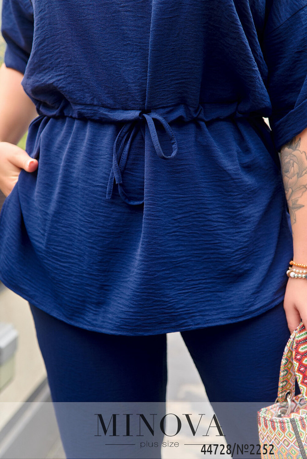 Мінімалістичний костюм батал, футболка без застібок та кишень, через талію під куліскою пропущено шнурок, з боків подолу - розрізи. Виріз горловини півкруглий. На рукавах невеликі відвороти. Брюки з високою талією, до поясу вшито резинку, з боків - кишені в шві.