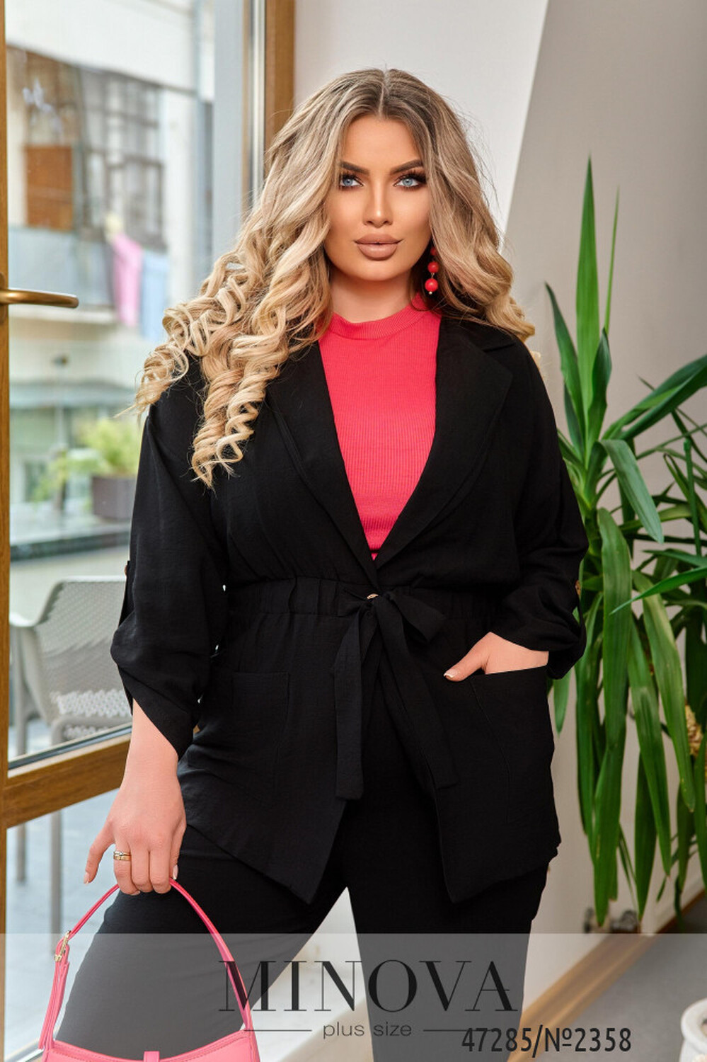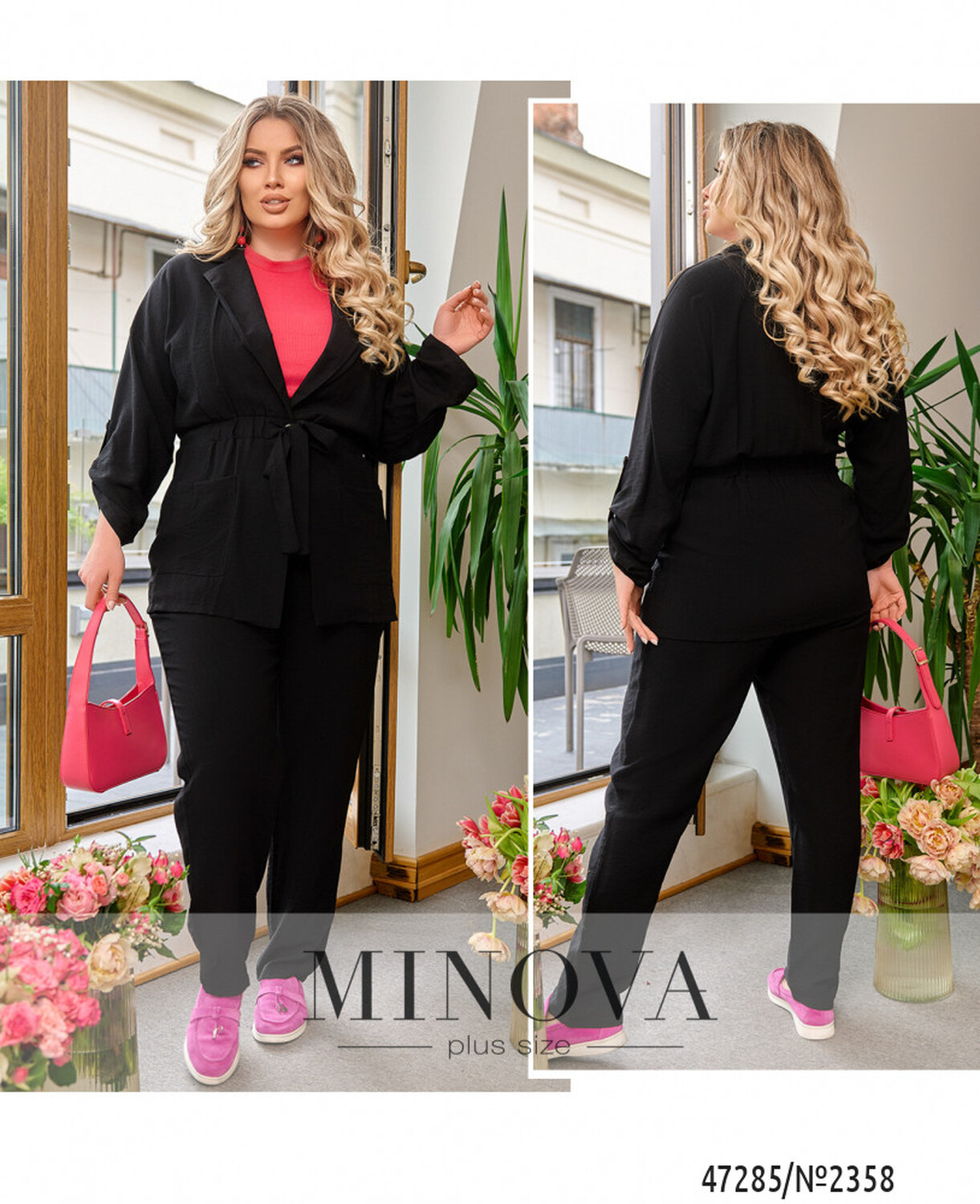 Стильний монохромний костюм – ідеальний варіант для теплої весни та спекотного літа. У комплект входять лаконічні штани на резинці з кишенями та блуза на зав'язках та резинці, вшитій по лінії таліі, виконана в формі жакета з коміром. Костюм може бути ідеально доповнений як класичними туфлями, так і лоферами чи кросівками.