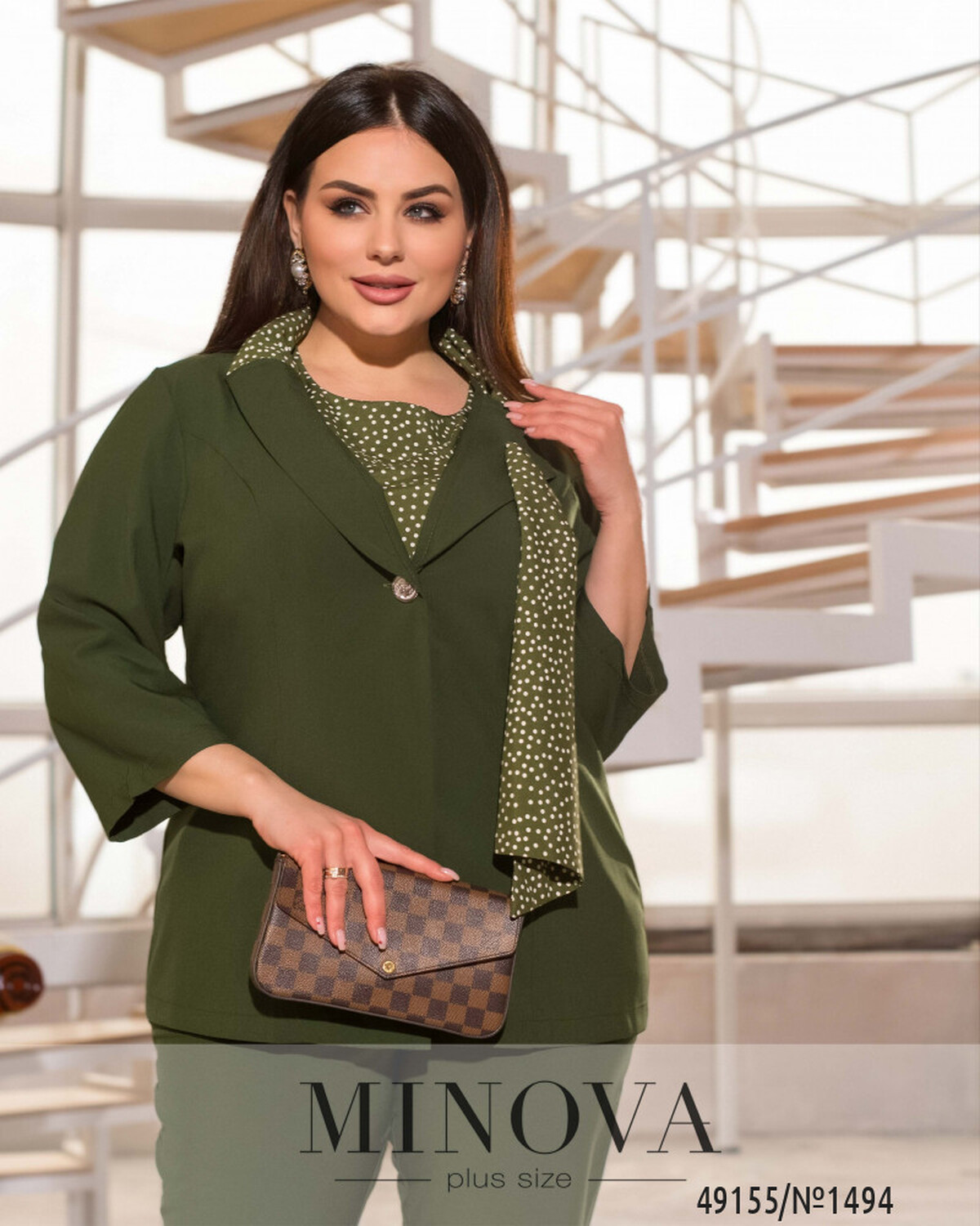Цей костюм трійка привертає увагу своїм витонченим та стильним дизайном. Він складається з піджака, який виготовлений з еврокостюмки та пришитим до підборту шарфиком з софту, який огинає виріб по шиї та переходить у петельку другого підбортику і додає неповторний шарм цьому образу, а також текстури. Широкий виріз V-форми підкреслює красу відкритої шиї, а широкі рукави довжини 7/8 додають елегантності цьому образу. Крім того, у комплекті є чарівна блуза в горошок з короткими рукавами, яка гармонійно поєднується з шарфиком на піджаку, зверніть увагу, що розмір принту може змінюватись в залежності від партії. А завершенням цього чудового комплекту є класичні брюки в тон піджака з гумкою на талії та бічними кишенями. Цей костюм трійка стане ідеальним вибором для бізнес-зустрічей, офіційних заходів та будь-яких інших важливих подій.
